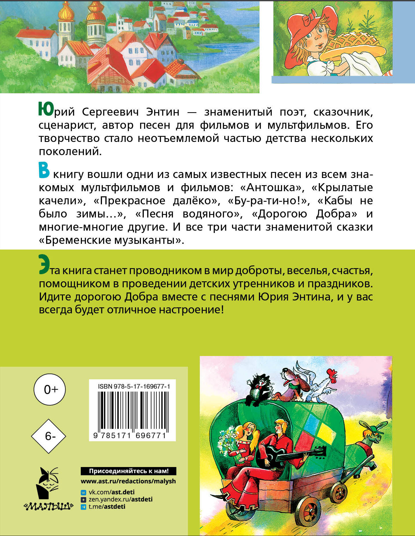 Юрий Сергеевич Энтин - знаменитый поэт, сказочник, сценарист, автор песен для фильмов и мультфильмов. Его творчество стало неотъемлемой частью детства нескольких поколений. В книгу вошли одни из самых известных песен из всем знакомых мультфильмов и фильмов: «Антошка», «Крылатые качели», «Прекрасное далёко», «Бу-ра-ти-но!», «Кабы не было зимы…», «Песня водяного», «Дорогою Добра» и многие-многие другие. И все три части знаменитой сказки «Бременские музыканты». Эта книга станет проводником в мир доброты, веселья, счастья, помощником в проведении детских утренников и праздников. Идите дорогою Добра вместе с песнями Юрия Энтина, и у вас всегда будет отличное настроение!| Издательство | Издательство "АСТ" |