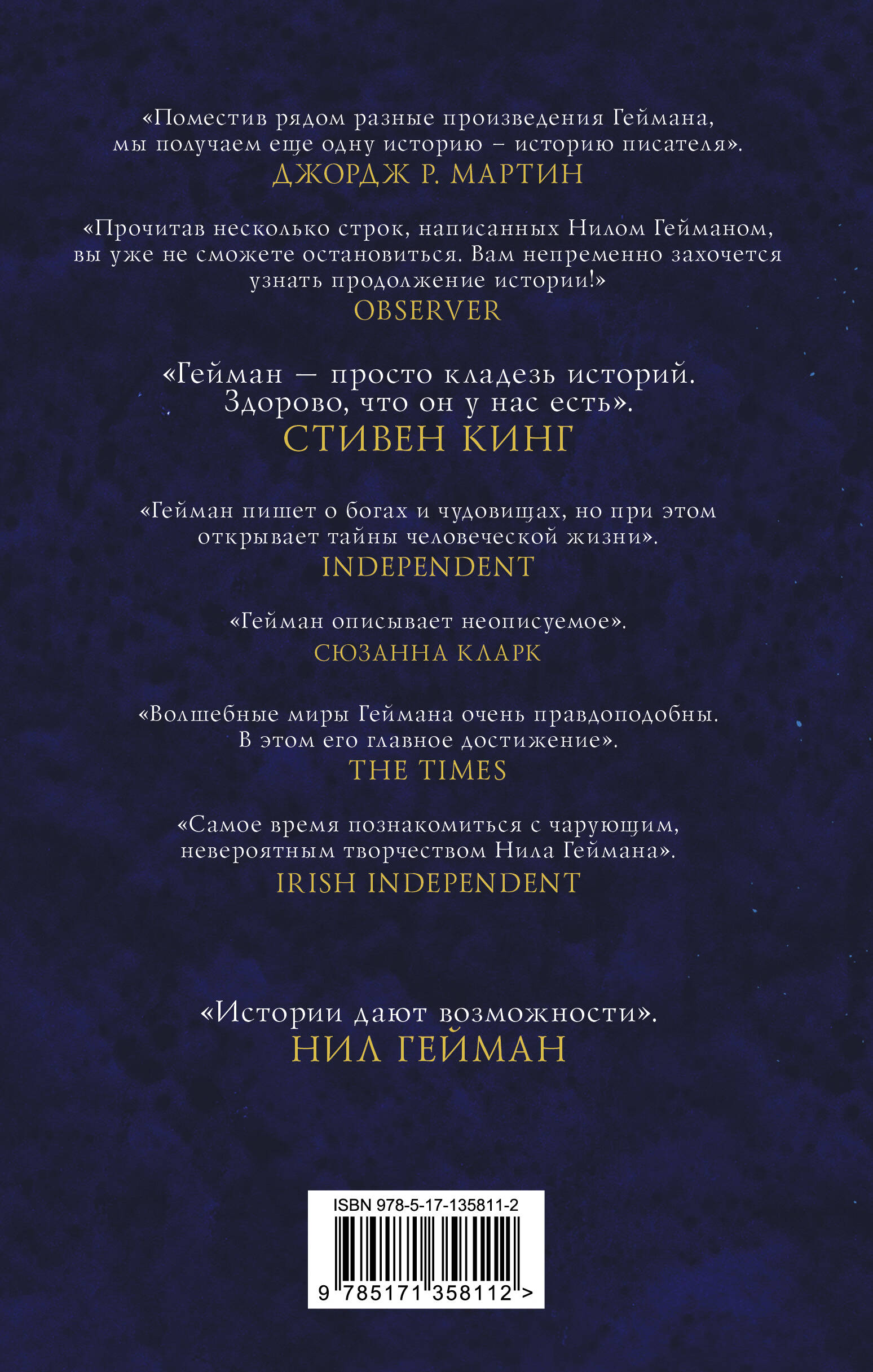 «Гейман - божественный рассказчик!» Стивен Фрай «Нил Гейман неповторим». Джордж Р.Р. Мартин «Поместив рядом разные произведения Геймана, мы получаем еще одну историю - историю писателя». Марлон Джеймс «Прочитав несколько строк, написанных Нилом Гейманом, вы уже не сможете остановиться. Вам непременно захочется узнать продолжение истории!» Observer «Гейман - просто кладезь историй. Здорово, что он у нас есть». Стивен Кинг «Гейман пишет о богах и чудовищах, но при этом открывает тайны человеческой жизни». Independent «Гейман описывает неописуемое». Сюзанна Кларк «Волшебные миры Геймана очень правдоподобны. В этом его главное достижение». The Times «Самое время познакомиться с чарующим, невероятным творчеством Нила Геймана». Irish Independent Нил Гейман: Истории дают возможности.| Издательство | ИЗДАТЕЛЬСТВО "АСТ" |