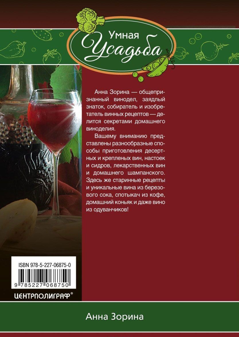 Анна Зорина-общепризнанный винодел, заядлый знаток, собиратель и изобретатель винных рецептов-делиться секретами домашнего виноделия. Вашему вниманию представлены разнообразные способы приготовления десертных и крепленых вин, настоек и сидров,лекарственных вин и домашнего шампанского. Здесь же старнинные рецептыи уникальные винаиз березового сока, спотыкач из кофе, домашний коньяк и даже вино из одуванчиков.