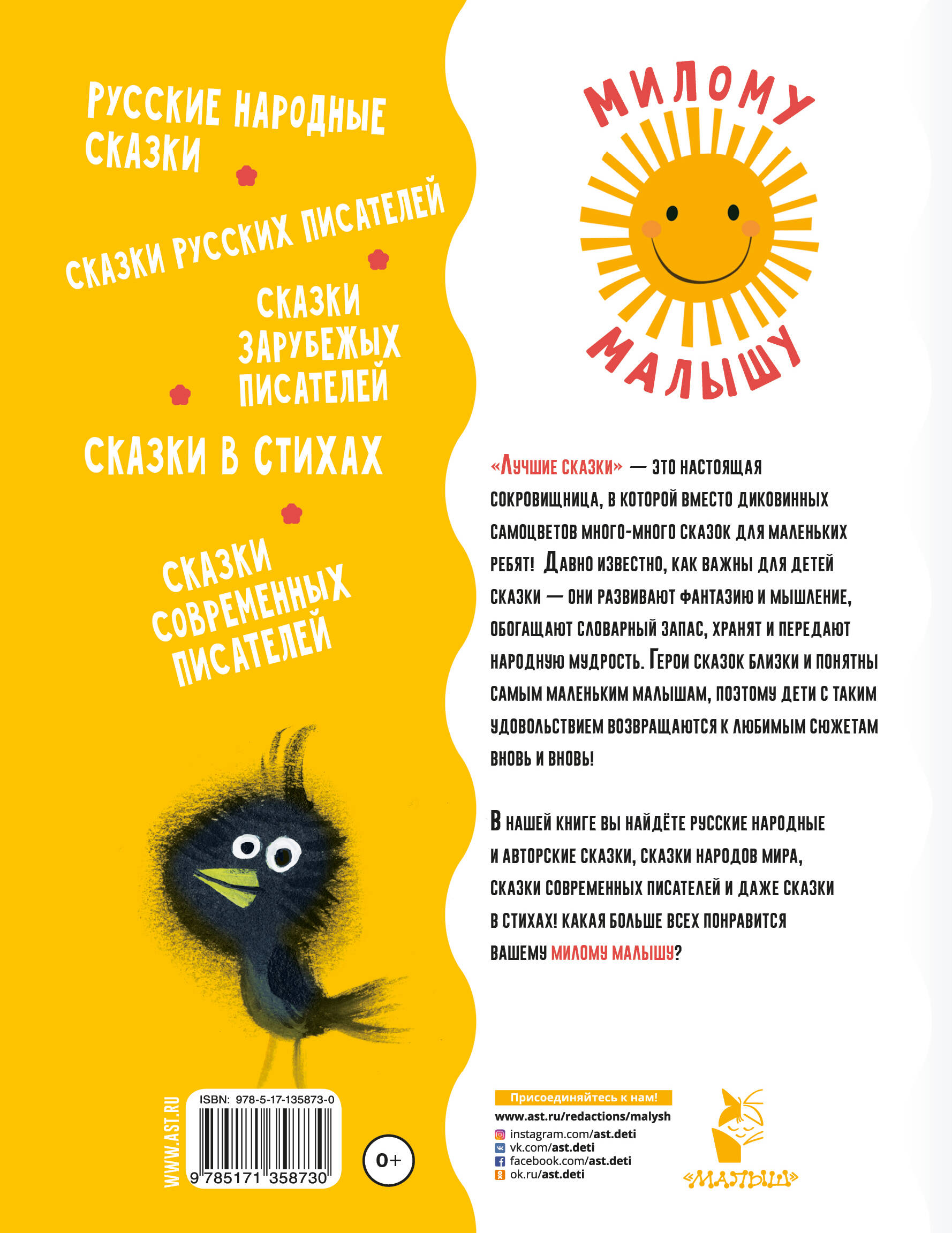 В нашу книгу вошли русские народные сказки ("Волк и козлята", "Заюшкина избушка"), сказки русских и зарубежных писателей (Л.Н. Толстого, В.И. Даля, Ш. Перро, Х.К. Андерсена), современные сказки (Э. Успенского, Г. Остера, А. Иванова), а также сказки в стихах (К. Чуковского, С. Маршака). Они познакомят маленького читателя с удивительно многообразным миром волшебной сказки, научат отличать добро и зло, помогут развить фантазию и речь ребёнка. В начале книги есть специальная страничка, где можно написать имя малыша и при желании приклеить фотографию милого крохи! Для дошкольного возраста.| Издательство | Издательство "АСТ" |