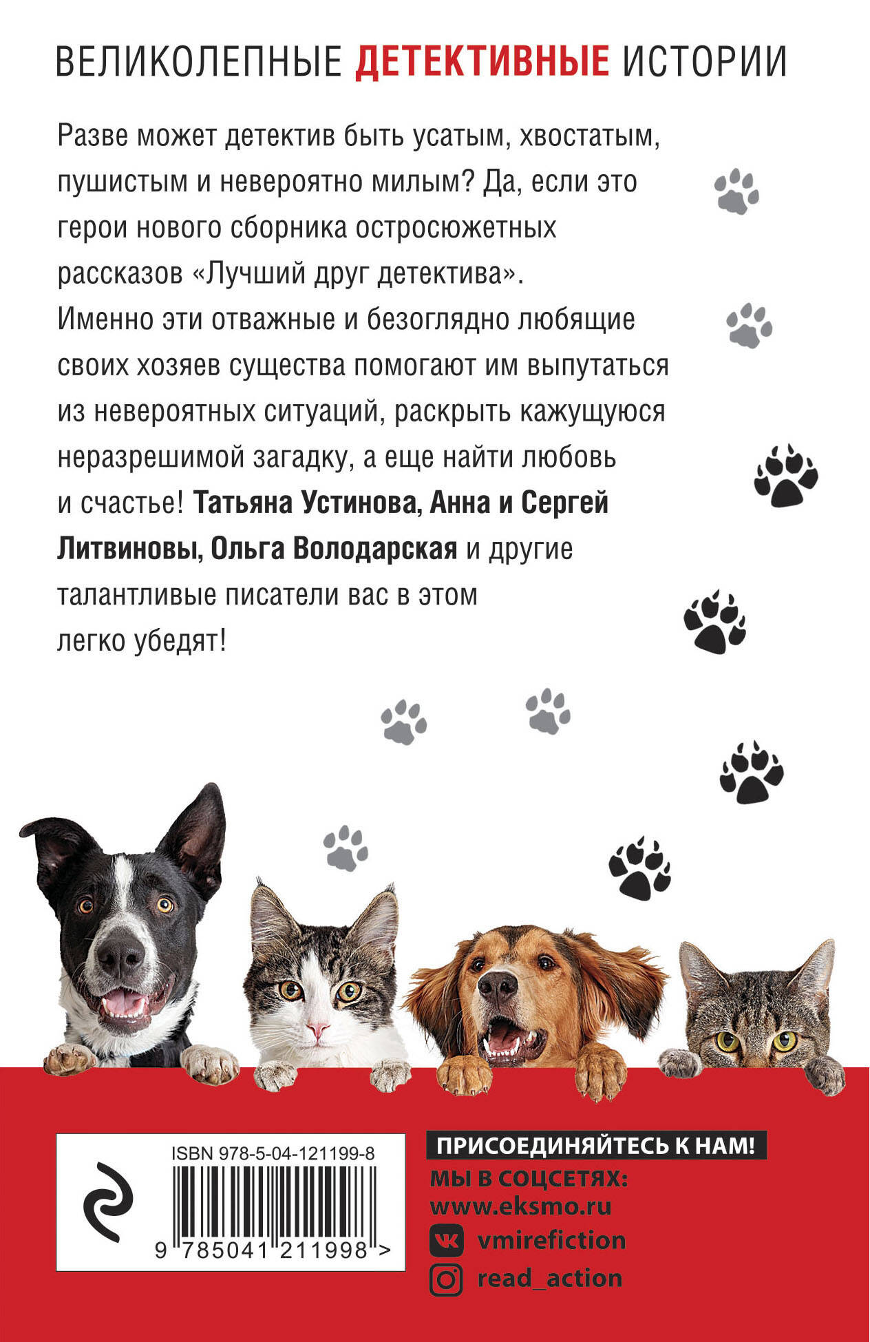 Разве может детектив быть усатым, хвостатым, пушистым и невероятно милым? Да, если это герои нового сборника остросюжетных рассказов "Лучший друг детектива". Именно эти отважные и безоглядно любящие своих хозяев существа помогают им выпутаться из невероятных ситуаций, раскрыть кажущуюся неразрешимой загадку, а еще найти любовь и счастье! Татьяна Устинова, Анна и Сергей Литвиновы, Ольга Володарская и другие талантливые писатели вас в этом легко убедят!| Издательство | ООО "Издательство "Эксмо" |