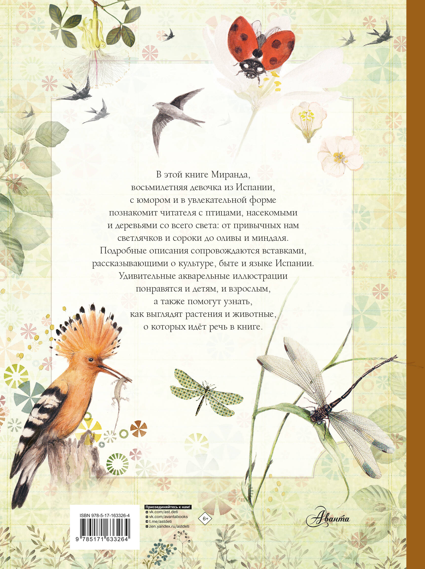 В этой книге Миранда, восьмилетняя девочка из Испании, с юмором и в увлекательной форме познакомит читателя с птицами, насекомыми и деревьями со всего света: от привычных нам светлячков и сороки до оливы и миндаля. Подробные описания сопровождаются вставками, рассказывающими о культуре, быте и языке Испании. Удивительные акварельные иллюстрации понравятся и детям, и взрослым, а также помогут узнать, как выглядят растения и животные, о которых идёт речь в книге. Для среднего школьного возраста.| Издательство | Издательство "АСТ" |