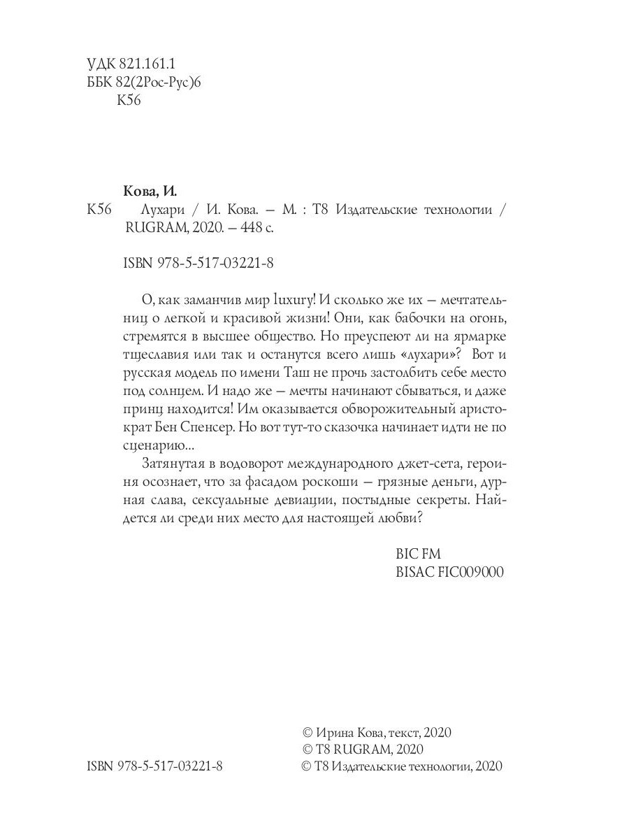 О, как заманчив мир luxury! И сколько же их - мечтательниц о легкой и красивой жизни! Они, как бабочки на огонь, стремятся в высшее общество. Но преуспеют ли на ярмарке тщеславия или так и останутся всего лишь «лухари»? Вот и русская модель по имени Таш не прочь застолбить себе место под солнцем. И надо же - мечты начинают сбываться, и даже принц находится! Им оказывается обворожительный аристократ Бен Спенсер. Но вот тут-то сказочка начинает идти не по сценарию... Затянутая в водоворот международного джет-сета, героиня осознает, что за фасадом роскоши - грязные деньги, дурная слава, сексуальные девиации, постыдные секреты. Найдется ли среди них место для настоящей любви?| Издательство | Т8 RUGRAM |