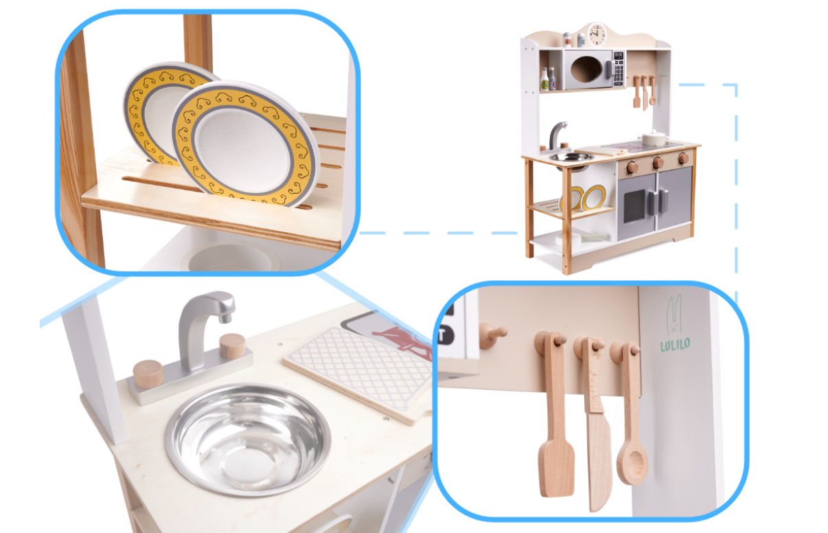 Она имеет множество функций настоящей кухни и оснащена раковиной, смесителем, плитой, микроволновой печью, а также полками и шкафчиками! Это сделает нахождение на настоящей кухне в будущем намного проще и приятнее.