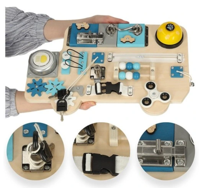 Но что такое манипулятивная доска? Обычно это деревянная доска с различными элементами (часто повседневного использования, например, замком с ключами), с которой малыш может играть, как ему заблагорассудится.
