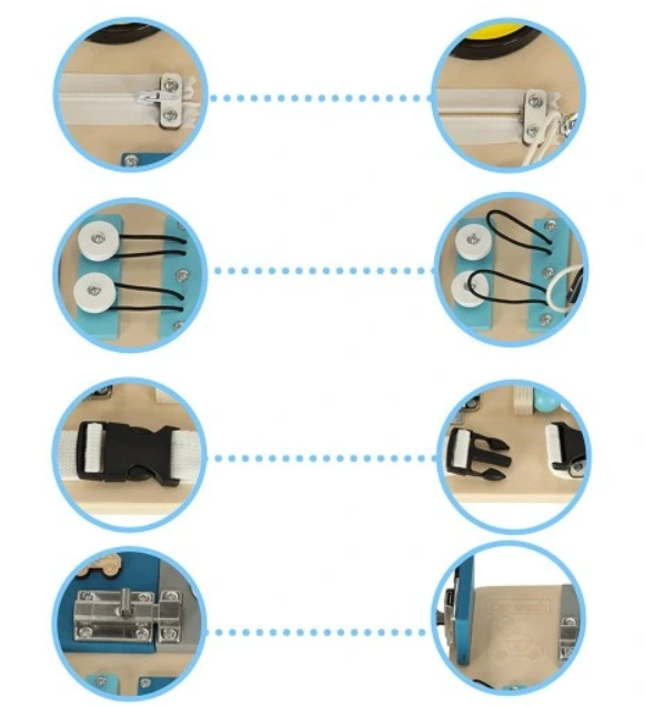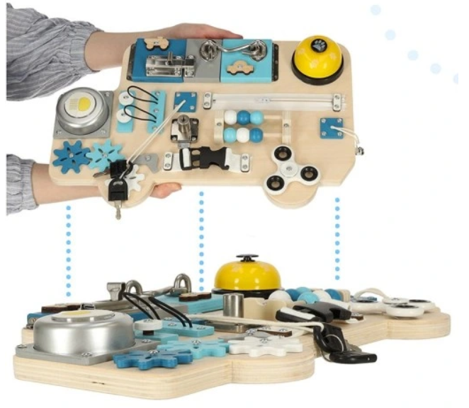 Играя с доской, малыш сможет двигать, нажимать, крутить и открывать все элементы, благодаря чему он будет постоянно развивать свои мануальные навыки и удовлетворять свое любопытство.