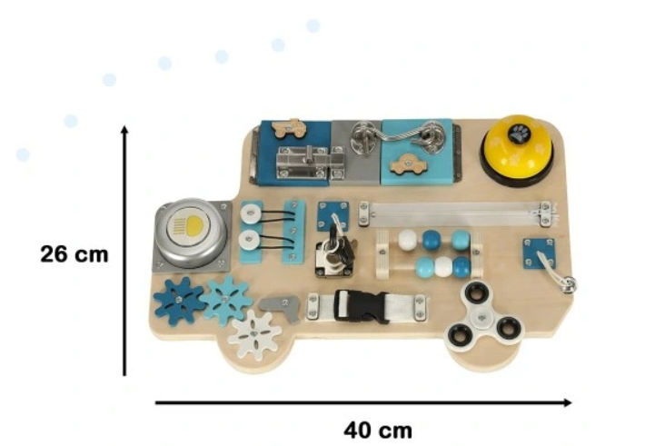 Эта доска выполнена в форме автобуса, что наверняка понравится каждому автолюбителю. Сенсорные элементы также отсылают к автомобильной промышленности - малыш найдет на доске деревянные машинки, а также рисунки заправочной станции и автомойки, спрятанные под разноцветными квадратами.