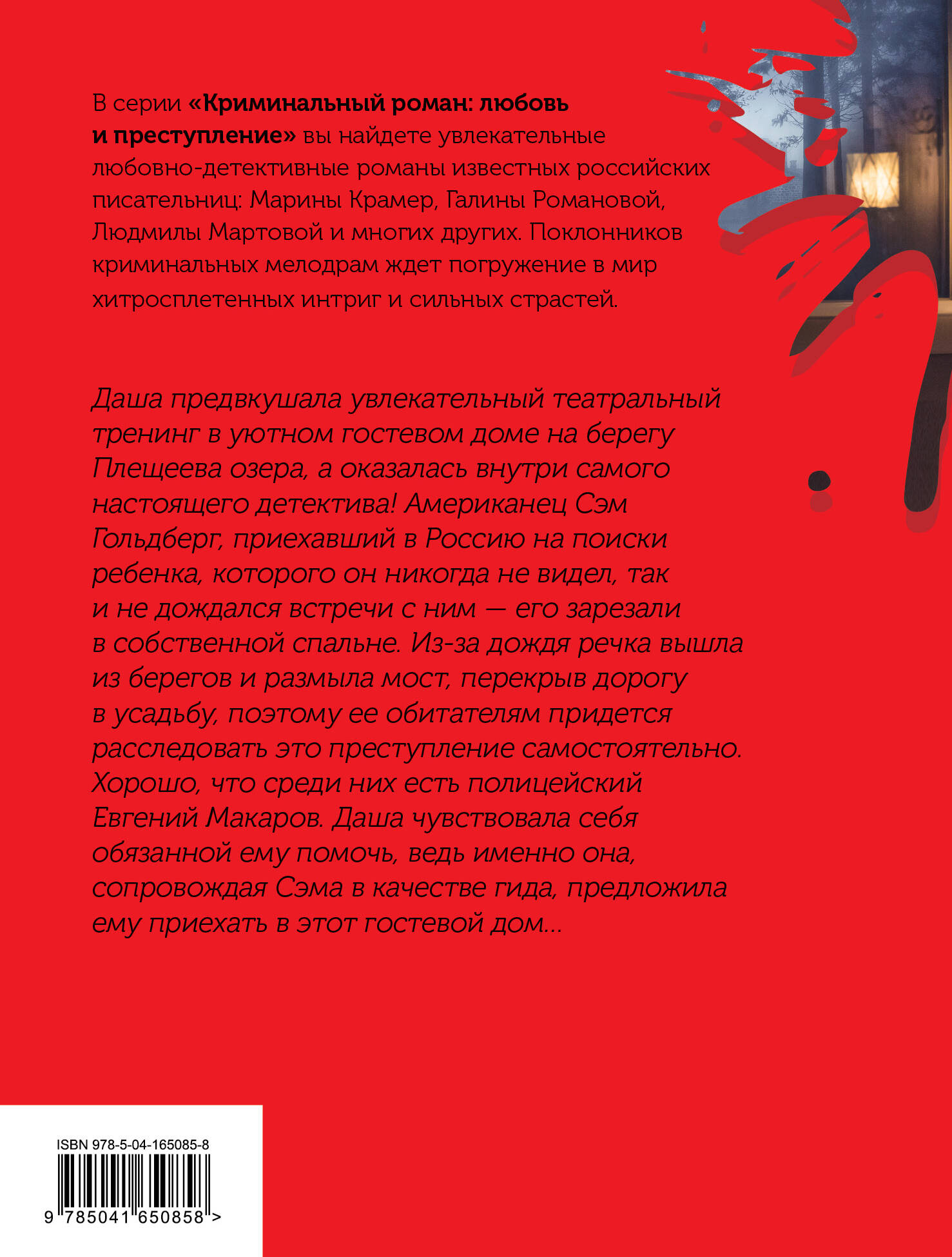 Даша предвкушала увлекательный театральный тренинг в уютном гостевом доме на берегу Плещеева озера, а оказалась внутри самого настоящего детектива! Американец Сэм Гольдберг, приехавший в Россию на поиски ребенка, которого он никогда не видел, так и не дождался встречи с ним - его зарезали в собственной спальне. Из-за дождя речка вышла из берегов и размыла мост, перекрыв дорогу в усадьбу, поэтому ее обитателям придется расследовать это преступление самостоятельно. Хорошо, что среди них есть полицейский Евгений Макаров. Даша чувствовала себя обязанной ему помочь, ведь именно она, сопровождая Сэма в качестве гида, предложила ему приехать в этот гостевой дом… Увлекательные любовно-детективные романы Людмилы Мартовой мотивируют читательниц на достижение своих целей и заставляют их поверить в то, что они достойны большего. Автор активно занимается самопродвижением, тиражи стабильно растут, поэтому не поверить ей нельзя. Людмила Мартова - пример для каждой из читательниц, как достичь своей мечты.| Издательство | Эксмо |