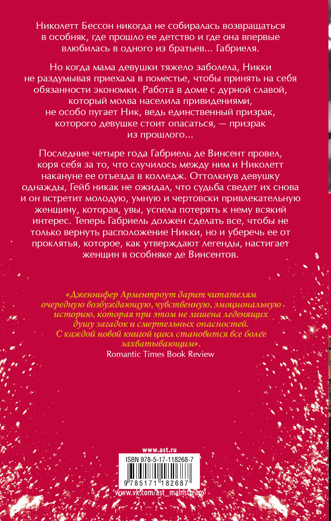 Николетт Бессон никогда не собиралась возвращаться в особняк, где прошло ее детство и где она впервые влюбилась в одного из братьев… Габриеля. Но когда мама девушки тяжело заболела, Никки не раздумывая приехала в поместье, чтобы принять на себя обязанности экономки. Работа в доме с дурной славой, который молва населила привидениями, не особо пугает Ник, ведь единственный призрак, которого девушке стоит опасаться, - призрак из прошлого… Последние четыре года Габриель де Винсент провел, коря себя за то, что случилось между ним и Николетт накануне ее отъезда в колледж. Оттолкнув девушку однажды, Гейб никак не ожидал, что судьба сведет их снова и он встретит молодую, умную и чертовски привлекательную женщину, которая, увы, успела потерять к нему всякий интерес. Теперь Габриель должен сделать все, чтобы не только вернуть расположение Никки, но и уберечь ее от проклятья, которое, как утверждают легенды, настигает женщин в особняке де Винсентов.| Издательство | ИЗДАТЕЛЬСТВО "АСТ" |