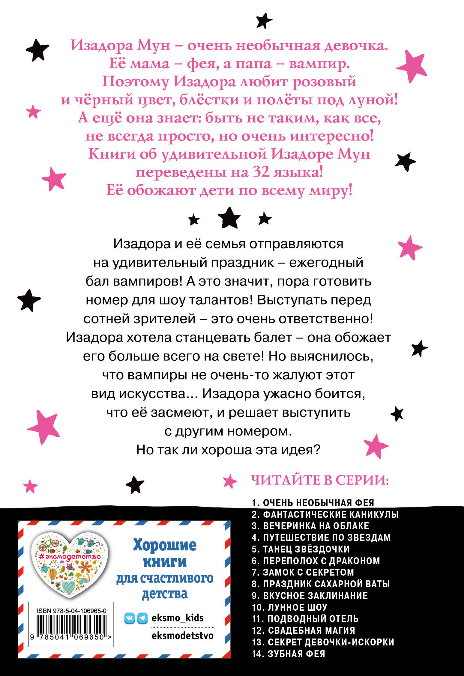 Ежегодный бал вампиров - событие, которое Изадора ждёт с нетерпением! Праздник под луной в готическом замке - что может быть лучше! Но выяснилось, что на него нужно обязательно приготовить творческий номер. Изадора сразу решает, что будет танцевать балет! У неё получается это лучше всего. Вот только вскоре выясняется, что вампиры не очень любят балет… Значит ли это, что нужно подготовить другой номер, который точно примет публика? Или всё же остаться верной себе? Изадоре предстоит сделать непростой выбор… Гарриет Манкастер - всемирно известная писательница и иллюстратор, книги которой переведены на 32 языка! А сама Изадора Мун - феномен во всём мире! Эта маленькая девочка - настоящий символ того, что каждый из нас может быть уникальным и неповторимым! «Лунное шоу» - книга, которая научит ребёнка оставаться верным себе в любой ситуации. Ищите в конце рецепт печенек, попкорна, а ещё много отличных идей для собственного шоу!| Издательство | ООО "Издательство "Эксмо" |