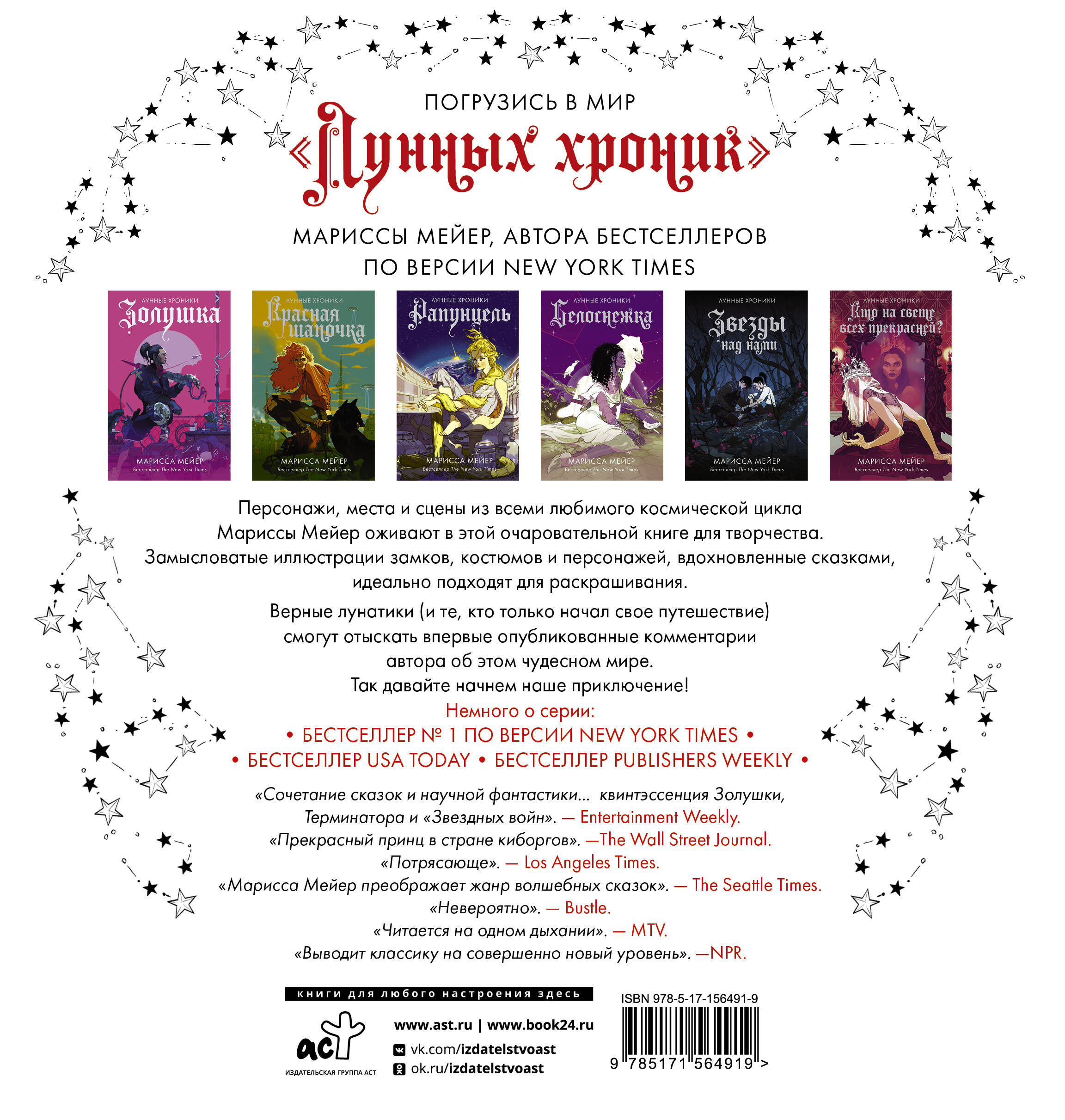 Приготовьтесь к незабываемому путешествию во вселенную «Лунных хроник» с книгой для творчества! Откройте для себя всеми любимый космический цикл Мариссы Мейер и превратите его в свое собственное искусство. Уникальные и детальные иллюстрации замков, костюмов и персонажей из серии, вдохновленные народными сказками, созданы специально для вашего раскрашивания. Вы станете художником этого захватывающего мира, оживляя его с помощью цвета и воображения. И для настоящих поклонников - эксклюзивные комментарии Мариссы Мейер о создании её уникальной вселенной, которые опубликованы впервые. Познакомьтесь с тонкостями этого чудесного мира, как вы никогда ранее не делали. Неважно, являетесь ли вы бывалым лунатиком, или только начинаете свое путешествие в серию «Лунные хроники» - эта книга станет вашим путеводителем, источником вдохновения и незаменимым сувениром. Приключение начинается прямо здесь, в ваших руках!| Издательство | ИЗДАТЕЛЬСТВО "АСТ" |