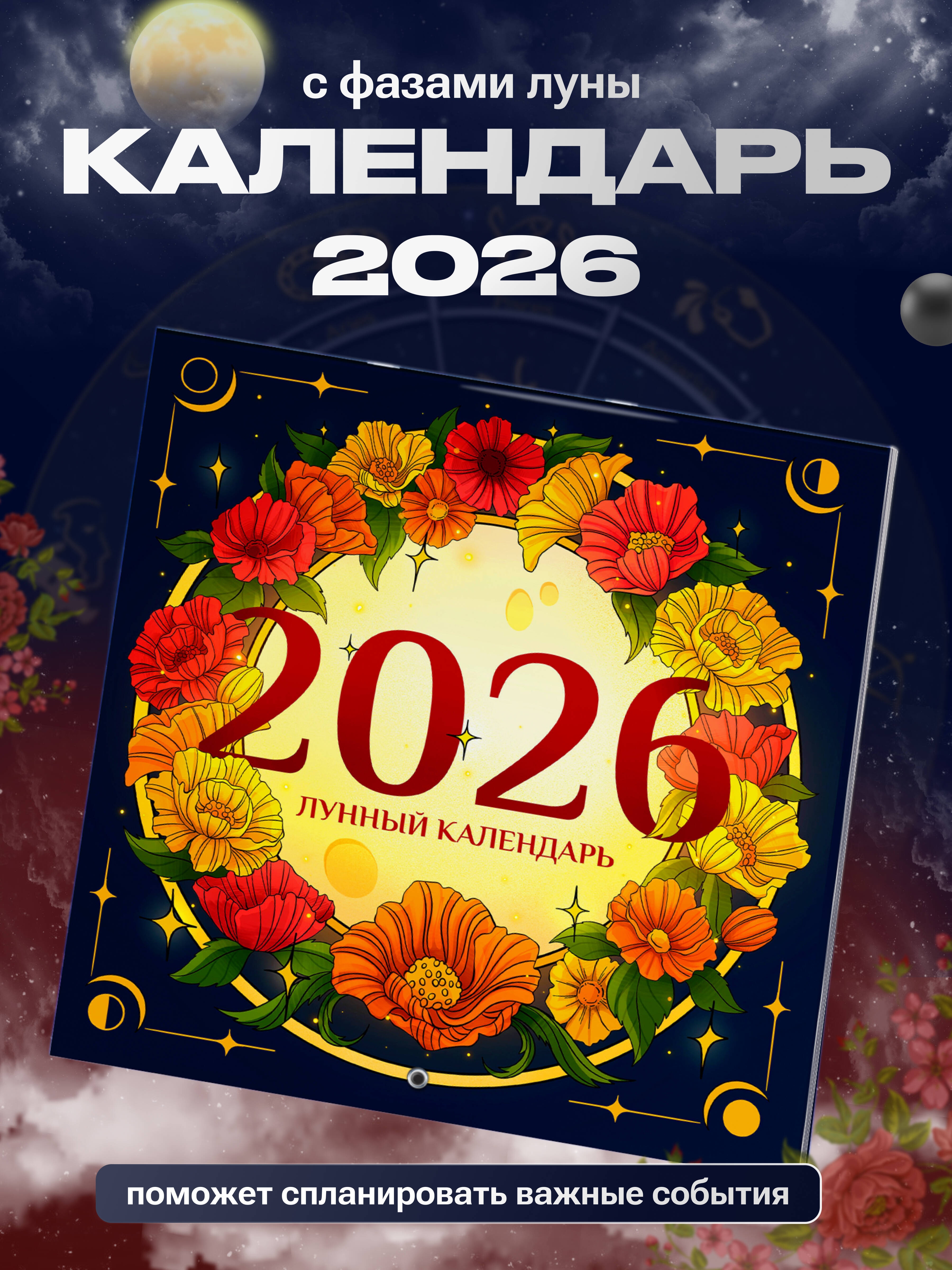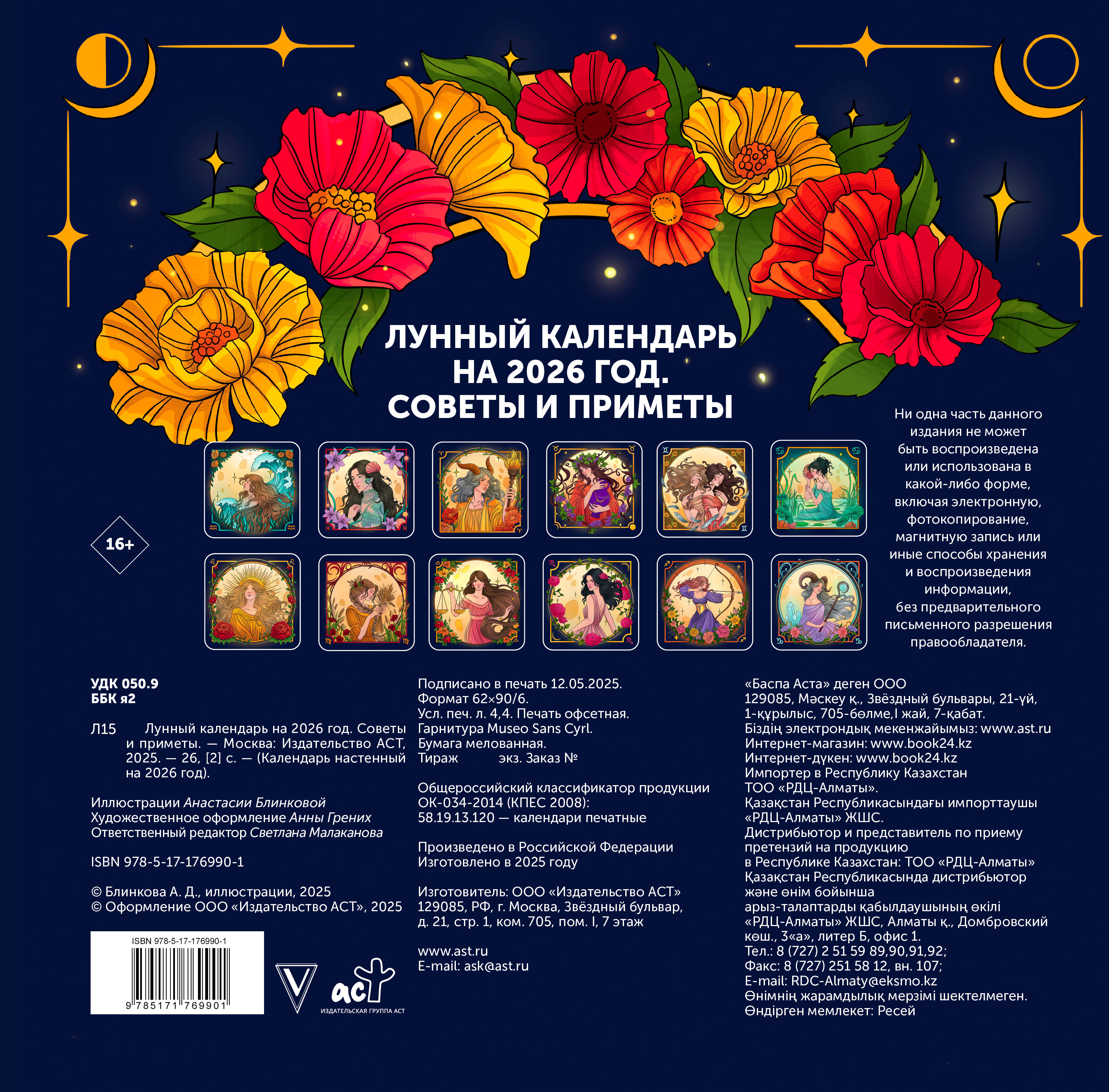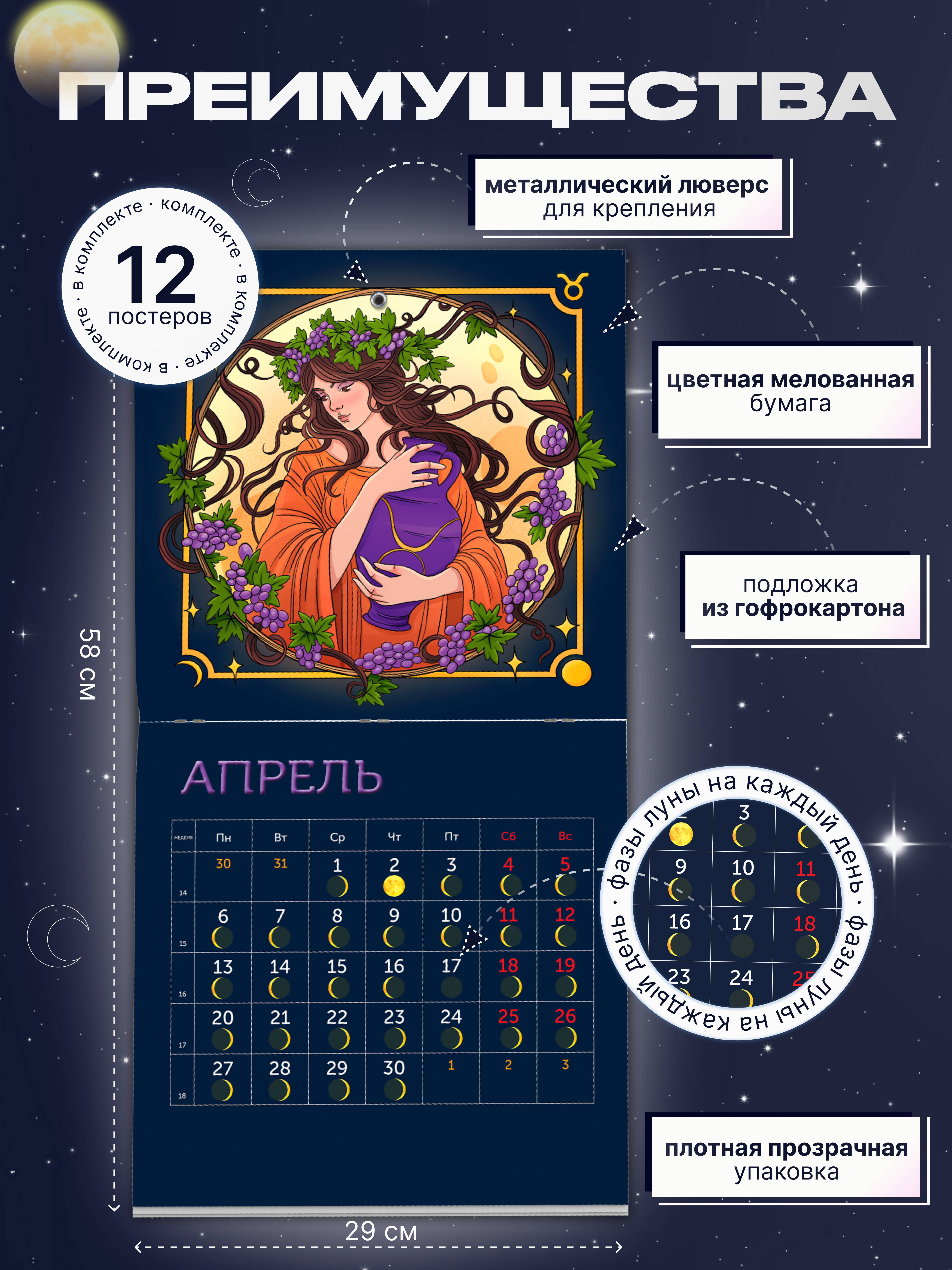 Ваш идеальный спутник в мире лунных циклов! Красочные иллюстрации украшают каждый месяц, отражая красоту природы и знаков зодиака. Настенный календарь точно показывает фазы Луны, положение знаков зодиака и периоды ретроградных планет. Планируйте свою жизнь гармонично, следуя природному ритму небесных светил. Идеален для поклонников астрологии, любителей следить за знаками зодиака и всех, кто хочет жить в гармонии с природой и Вселенной. Яркие и красивые иллюстрации каждого месяца создадут уют и поднимут настроение. Крупная удобная сетка позволит легко планировать дела и события. Точно отображены фазы Луны и периоды ретроградных планет. Этот календарь станет отличным подарком себе и близким, украсит интерьер дома или офиса и подарит вдохновение на весь год!| Издательство | Издательство "АСТ" |