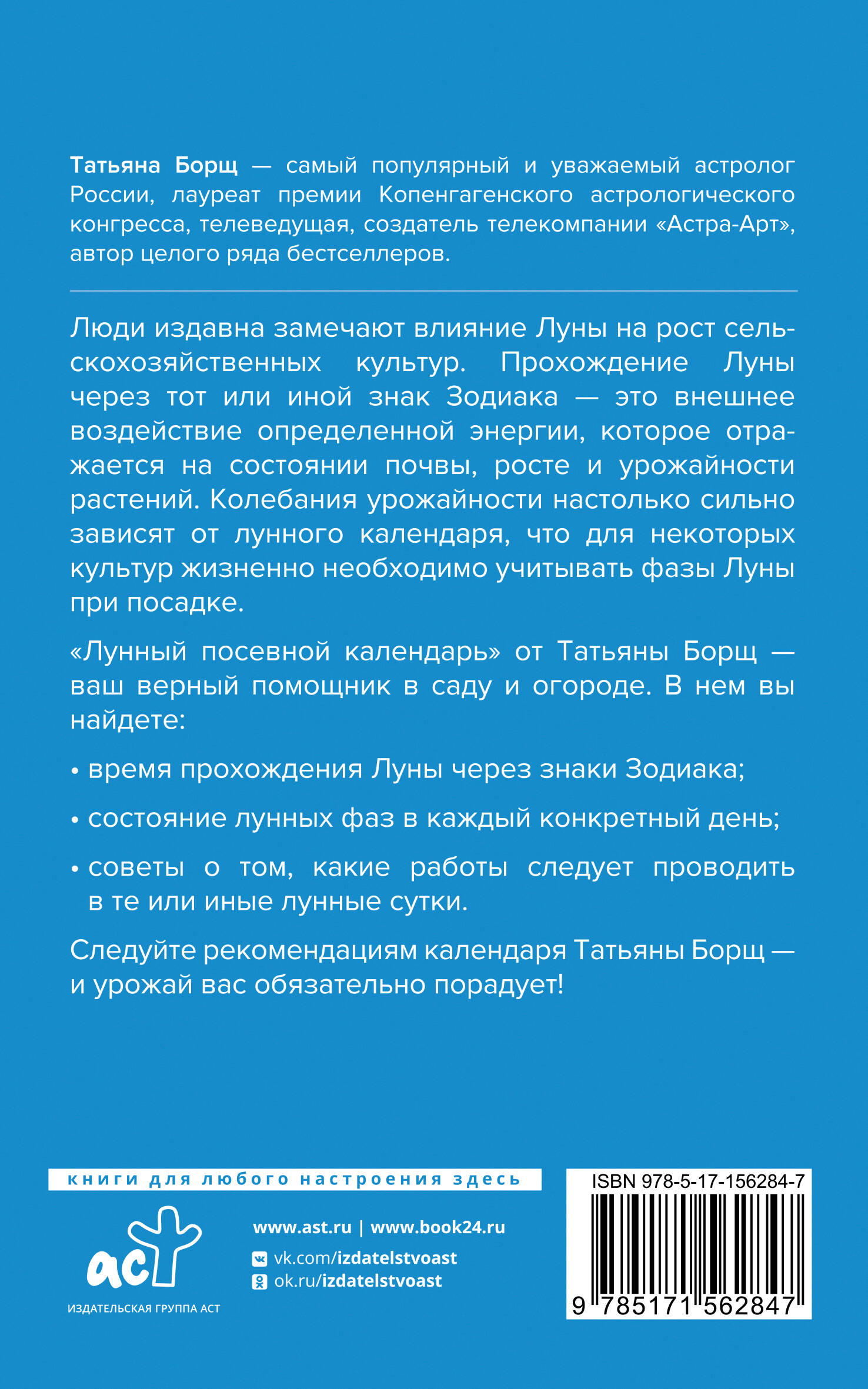 Татьяна Борщ - самый популярный и уважаемый астролог России, лауреат премии Копенгагенского астрологического конгресса, телеведущая, создатель телекомпании "Астра-Арт", автор целого ряда бестселлеров. Люди издавна замечают влияние Луны на рост сельскохозяйственных культур. Прохождение Луны через тот или иной знак Зодиака - это внешнее воздействие определенной энергии, которое отражается на состоянии почвы, росте и урожайности растений. Колебания урожайности настолько сильно зависят от лунного календаря, что для некоторых культур жизненно необходимо учитывать фазы Луны при посадке. "Лунный посевной календарь" от Татьяны Борщ - ваш верный помощник в саду и огороде. В нем вы найдете: • время прохождения Луны через знаки Зодиака; • состояние лунных фаз в каждый конкретный день; • советы о том, какие работы следует проводить в те или иные лунные сутки. Следуйте рекомендациям календаря Татьяны Борщ - и урожай вас обязательно порадует!| Издательство | ИЗДАТЕЛЬСТВО "АСТ" |