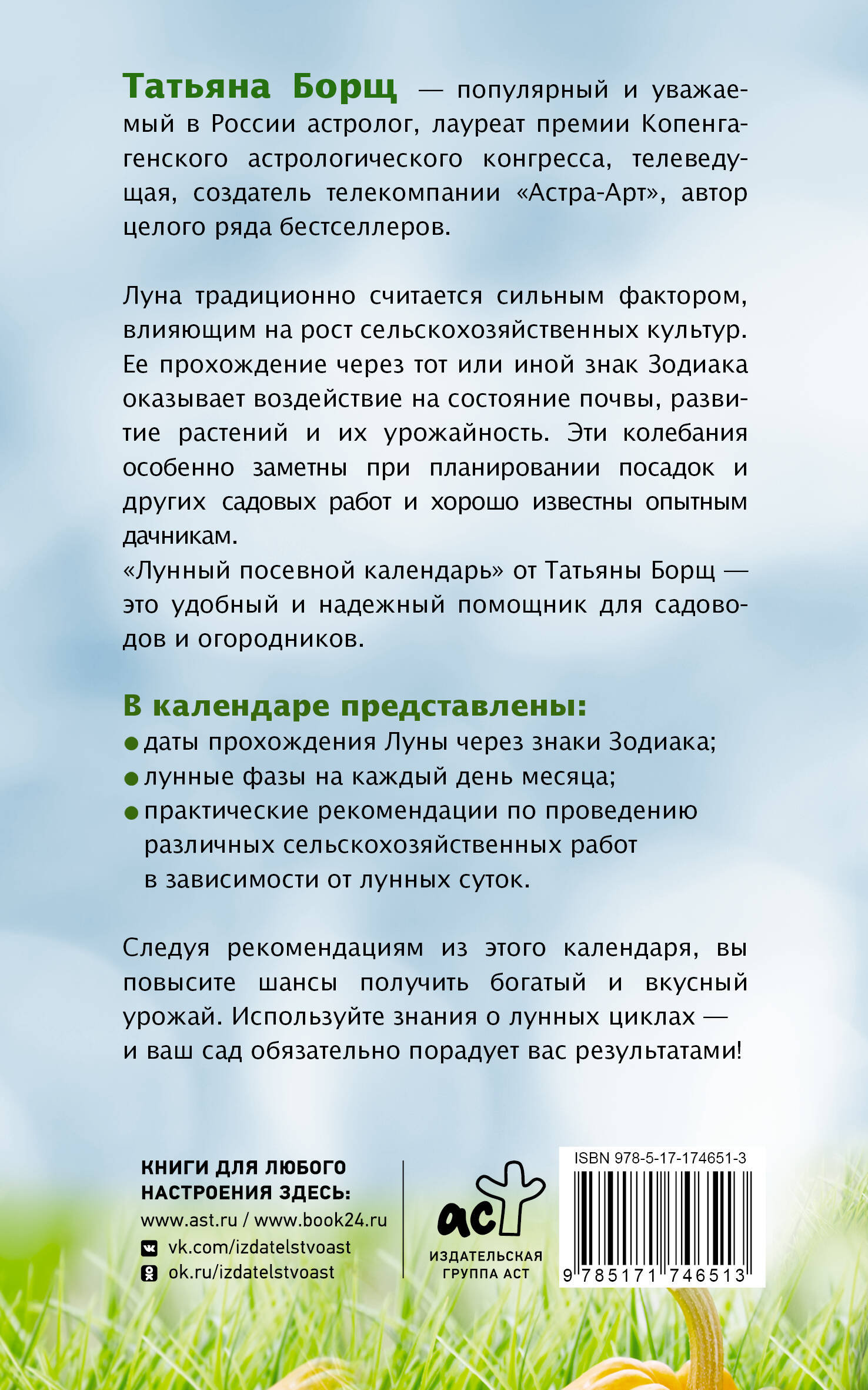 Татьяна Борщ - популярный и уважаемый в России астролог, лауреат премии Копенгагенского астрологического конгресса, телеведущая, создатель телекомпании "Астра-Арт", автор целого ряда бестселлеров. Луна традиционно считается сильным фактором, влияющим на рост сельскохозяйственных культур. Ее прохождение через тот или иной знак Зодиака оказывает воздействие на состояние почвы, развитие растений и их урожайность. Эти колебания особенно заметны при планировании посадок и других садовых работ и хорошо известны опытным дачникам. "Лунный посевной календарь" от Татьяны Борщ - это удобный и надежный помощник для садоводов и огородников. В нем представлены: - даты прохождения Луны через знаки Зодиака; - лунные фазы на каждый день месяца; - практические рекомендации по проведению различных сельскохозяйственных работ в зависимости от лунных суток. Следуя рекомендациям из этого календаря, вы повысите шансы получить богатый и вкусный урожай. Используйте знания о лунных циклах - и ваш сад обязательно порадует вас результатами!| Издательство | Издательство "АСТ" |