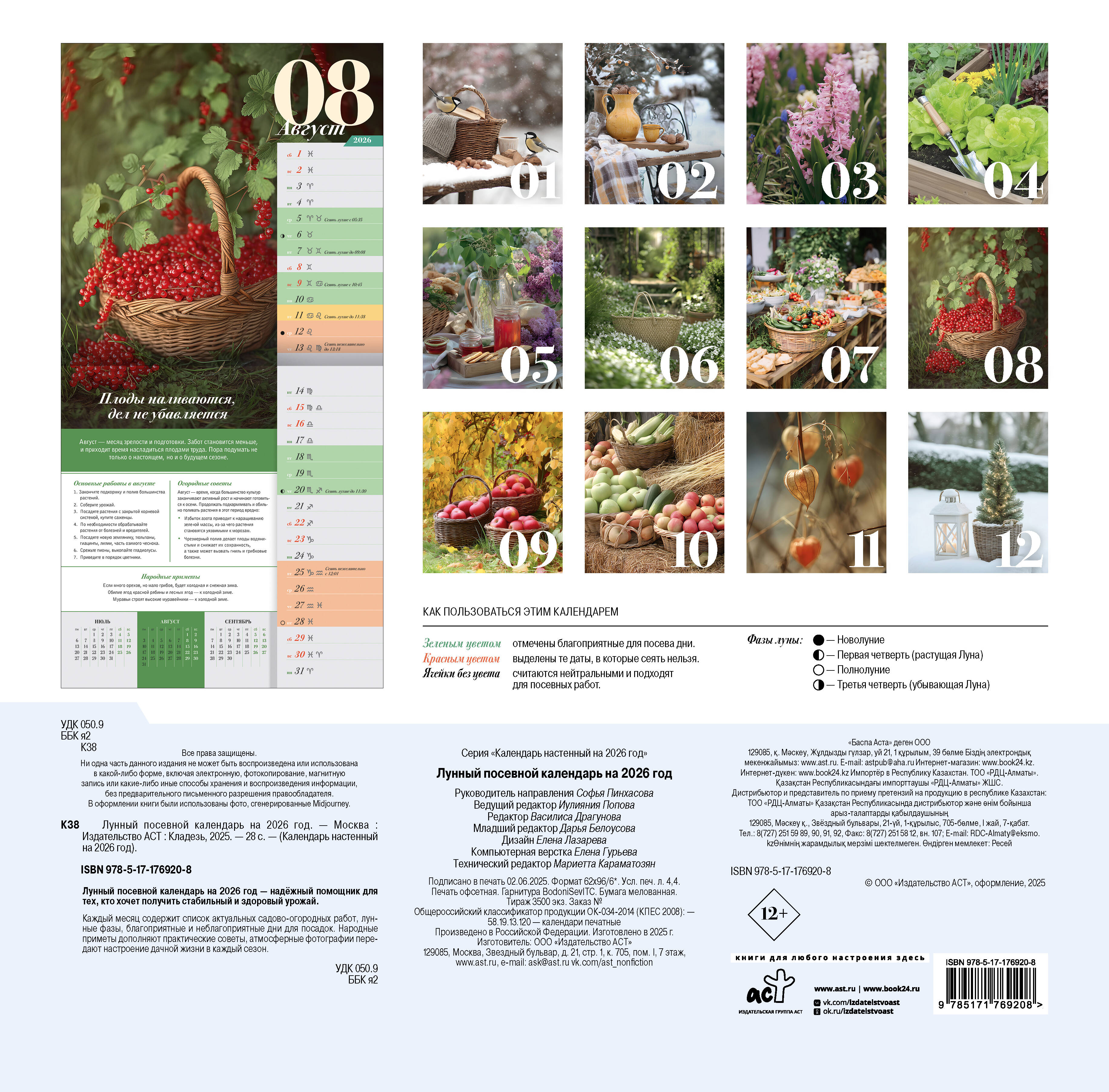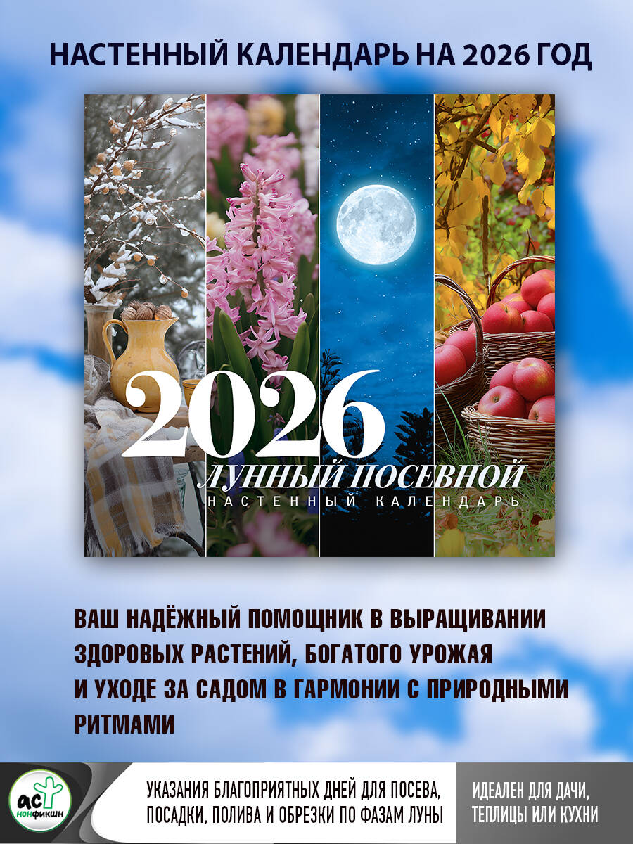 Лунный посевной календарь на 2026 год - надёжный помощник для тех, кто хочет получить стабильный и здоровый урожай. Каждый месяц содержит список актуальных садово-огородных работ, лунные фазы, благоприятные и неблагоприятные дни для посадок. Народные приметы дополняют практические советы, атмосферные фотографии передают настроение дачной жизни в каждый сезон.| Издательство | Издательство "АСТ" |