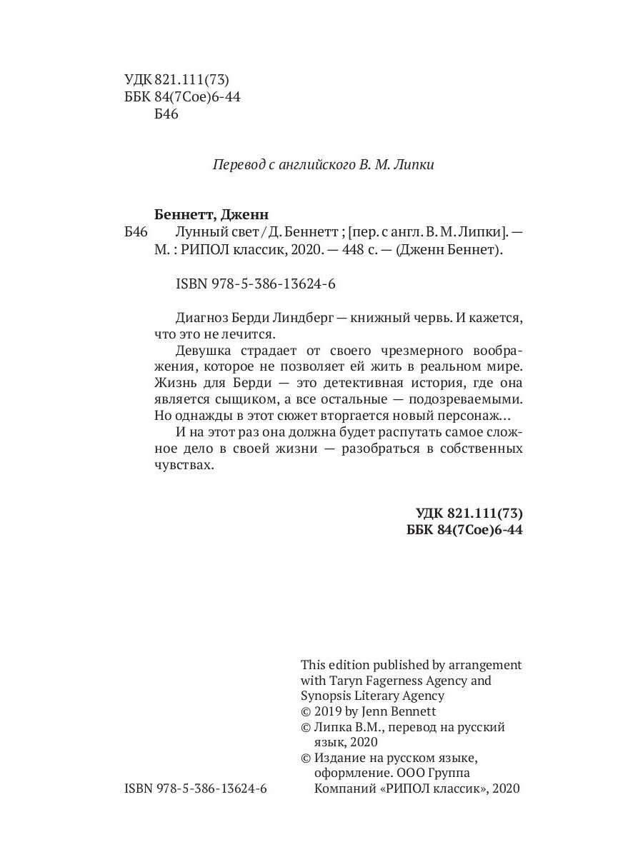Диагноз Берди Линдберг - книжный червь. И кажется, что это не лечится. Девушка страдает от своего чрезмерного воображения, которое не позволяет ей жить в реальном мире. Жизнь для Берди - это детективная история, где она является сыщиком, а все остальные - подозреваемыми. Но однажды в этот сюжет вторгается новый персонаж... И на этот раз она должна будет распутать самое сложное дело в своей жизни - разобраться в собственных чувствах.| Издательство | Рипол Классик |