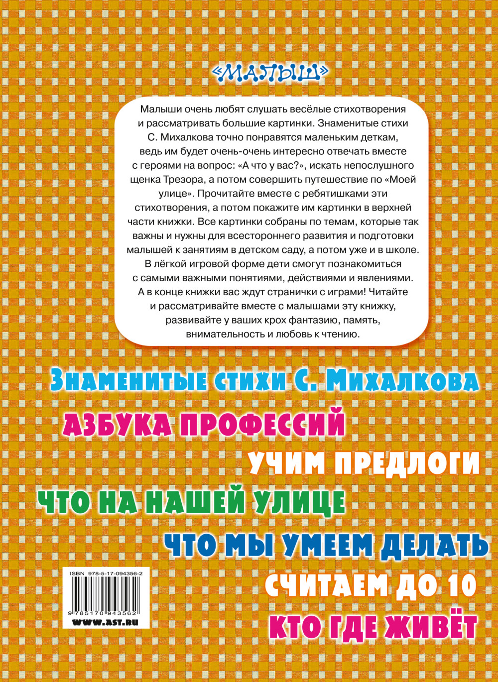 В книгу С. Михалкова «Любимые стихи» вошли самые знаменитые произведения автора - «А что у вас?», «Трезор» и «Моя улица». Прочитайте детям стихотворения, а потом покажите им картинки вверху страничек. Все картинки собраны по темам, которые малышам нужно будет узнать в детском саду. Дети познакомятся с профессиями, узнают, как «говорят» животные и что можно купить в разных магазинах. И ещё много всего интересного. В конце каждой книжки из серии «Первая книга малыша: чтение и обучение» есть страничка для весёлых игр и закрепления пройденного материала. Книги из этой серии помогут малышам в игровой форме узнать много о мире, в котором они живут, развить фантазию, расширить кругозор и стать самыми умными малышами.