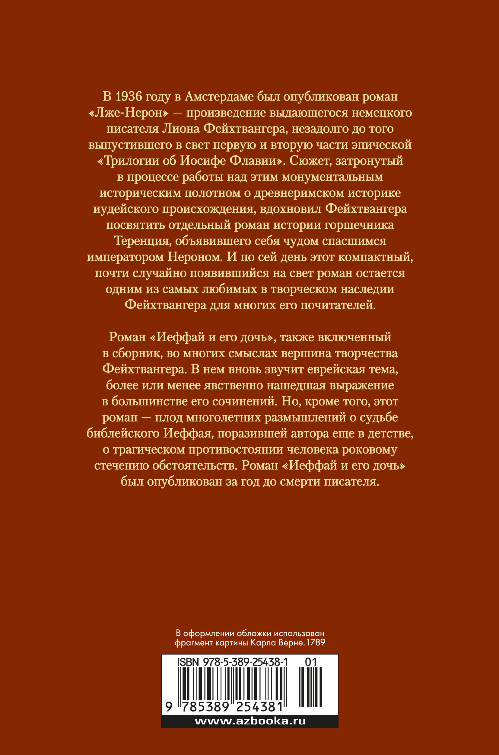 В 1936 году в Амстердаме был опубликован роман "Лже-Нерон" - произведение выдающегося немецкого писателя Лиона Фейхтвангера, незадолго до того выпустившего в свет первую и вторую части эпической "Трилогии об Иосифе Флавии". Сюжет, затронутый в процессе работы над этим монументальным историческим полотном о древнеримском историке иудейского происхождения, вдохновил Фейхтвангера посвятить отдельный роман истории горшечника Теренция, объявившего себя чудом спасшимся императором Нероном. И по сей день этот компактный, почти случайно появившийся на свет роман остается одним из самых любимых в творческом наследии Фейхтвангера для многих его почитателей. Роман "Иеффай и его дочь", также включенный в сборник, во многих смыслах вершина творчества Фейхтвангера. В нем вновь звучит еврейская тема, более или менее явственно нашедшая выражение в большинстве его сочинений. Но, кроме того, этот роман - плод многолетних размышлений о судьбе библейского Иеффая, поразившей автора еще в детстве, о трагическом противостоянии человека роковому стечению обстоятельств. Роман "Иеффай и его дочь" был опубликован за год до смерти писателя.| Издательство | Азбука-Аттикус Издат.группа ООО |