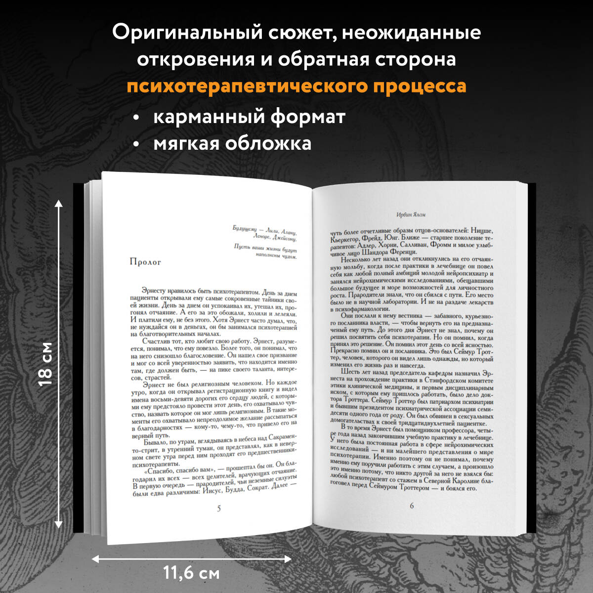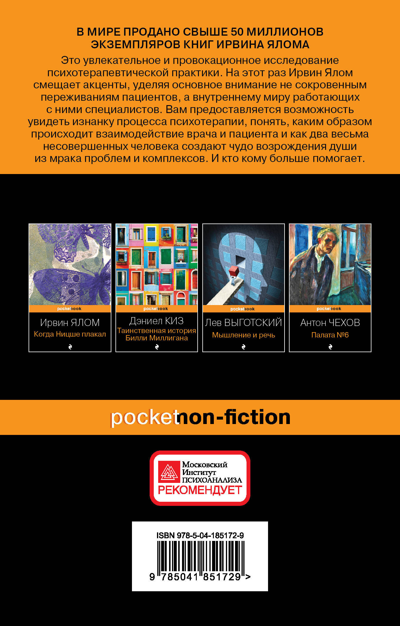 Интригующий сюжет, потрясающие открытия, проницательный и беспристрастный взгляд на терапевтическую работу. Ялом показывает изнанку терапевтического процесса, позволяет читателю вкусить запретный плод и узнать, о чем же на самом деле думают психотерапевты во время сеансов. Книга Ялома - прекрасная смотровая площадка, с которой ясно видно, какие страсти владеют участниками психотерапевтического процесса.| Издательство | ООО "Издательство "Эксмо" |