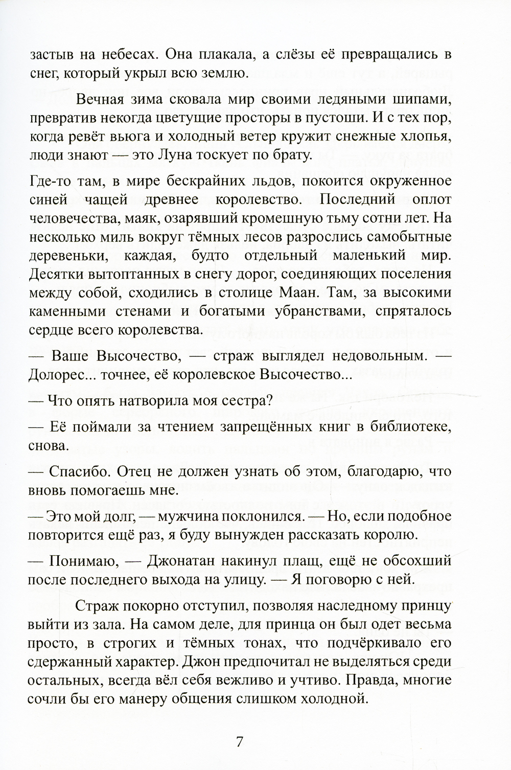 Заснеженная пустошь - вот всё, что осталось человечеству после великого противостояния Солнца и Луны. Королевство Маан стало колыбелью, приютившей выживших за высокими стенами. Спустя столетья люди смогли приспособиться к вечному холоду, постепенно позабыв истинную причину своих бед. Юная принцесса ледяного королевства скована рамками предрассудков и запретов. Её горячее сердце жаждет увидеть чудеса мира и узнать его тайны. Однако не раз девушка пожалеет о дерзких мечтах, ведь им суждено исполнится совсем не так, как она того желала. Эта история пропитана волшебным духом севера, наполнена захватывающими приключениями и поисками своего истинного «Я». В ней заложены понятия о долге, любви, взаимопомощи и дружбе, приправленные юмором и самобытным фольклором.| Издательство | Т8 RUGRAM |