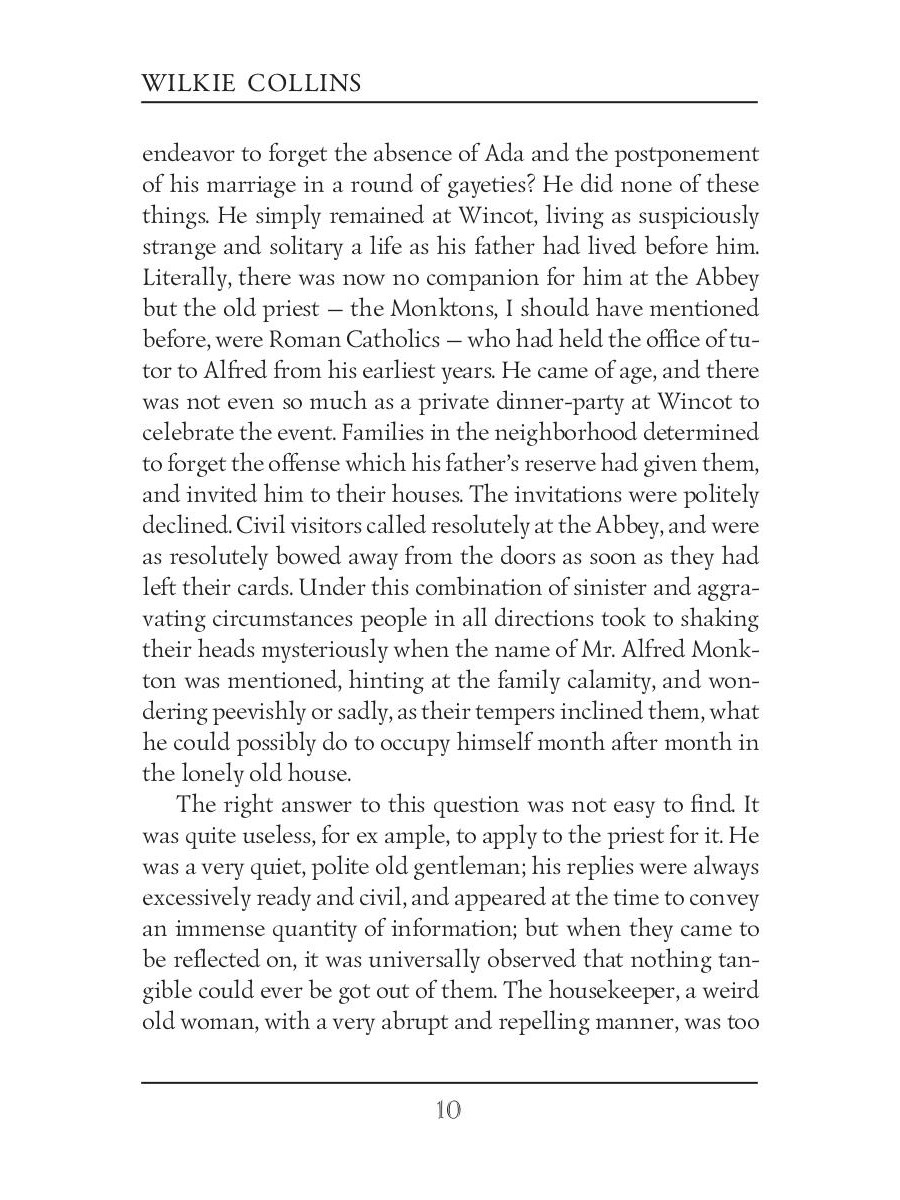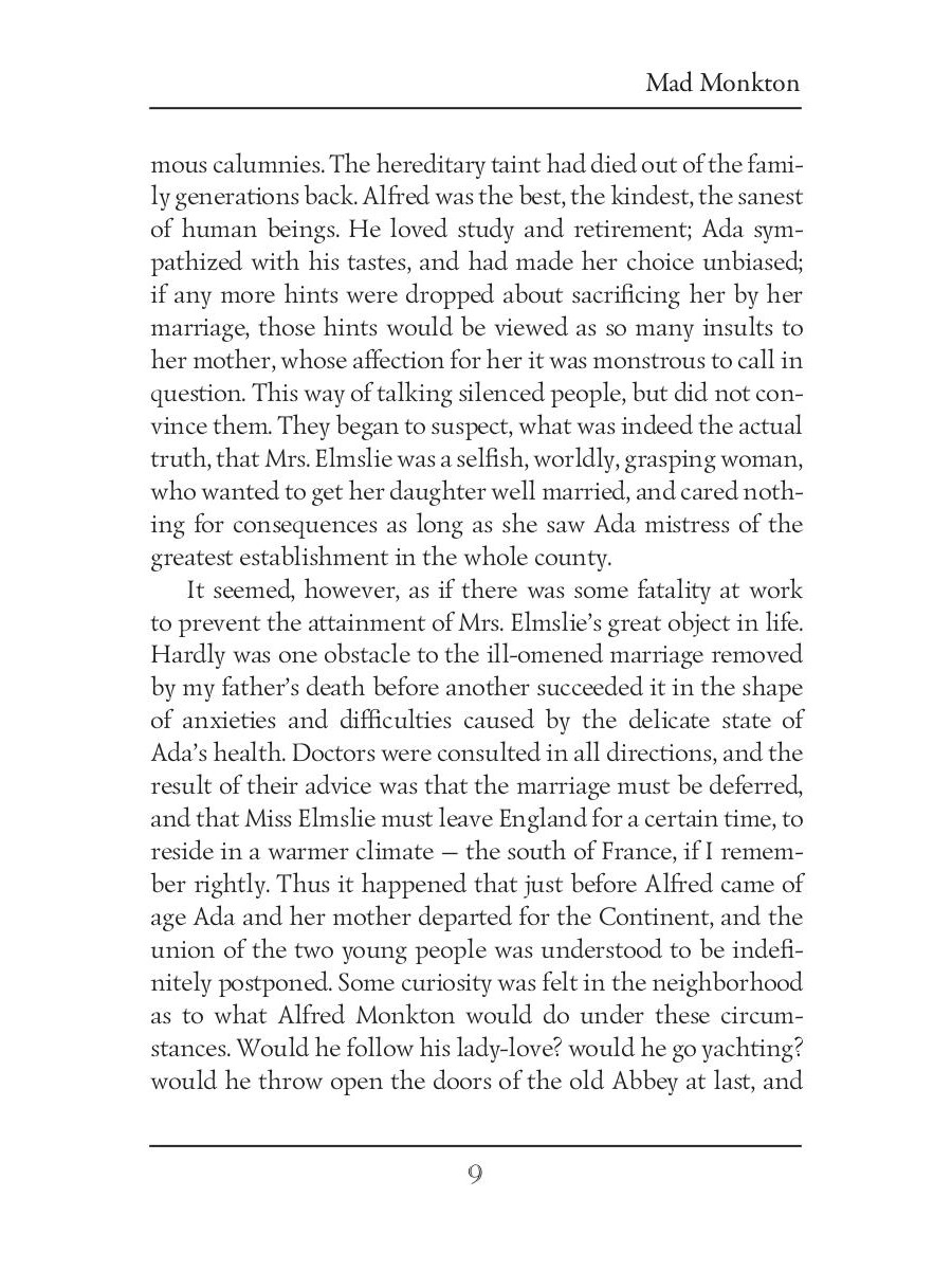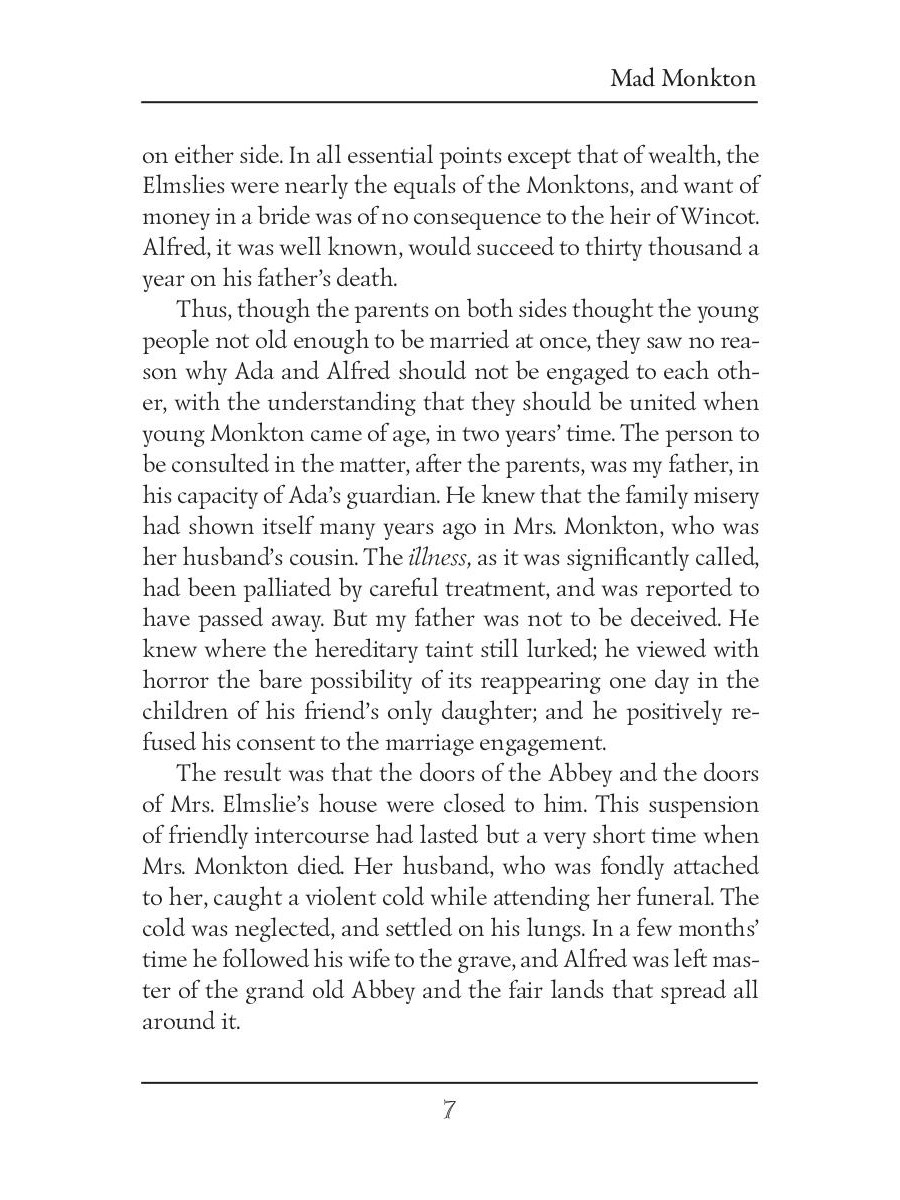 William Wilkie Collins was an English novelist, playwright, and short story writer. Mad Monkton is a bizarre ghost story. It is said that a strain of hereditary madness blights the Monkton family, heirs to the huge domain of Wincot Abbey. Rumours in the neighbourhood are that Alfred, the youngest scion, has inherited this insanity. He is is engaged to his childhood sweetheart, Ada Elmslie. However, Alfred suddenly departs for Italy, seeking the corpse of his disreputable uncle, who is believed to have been killed in a duel.