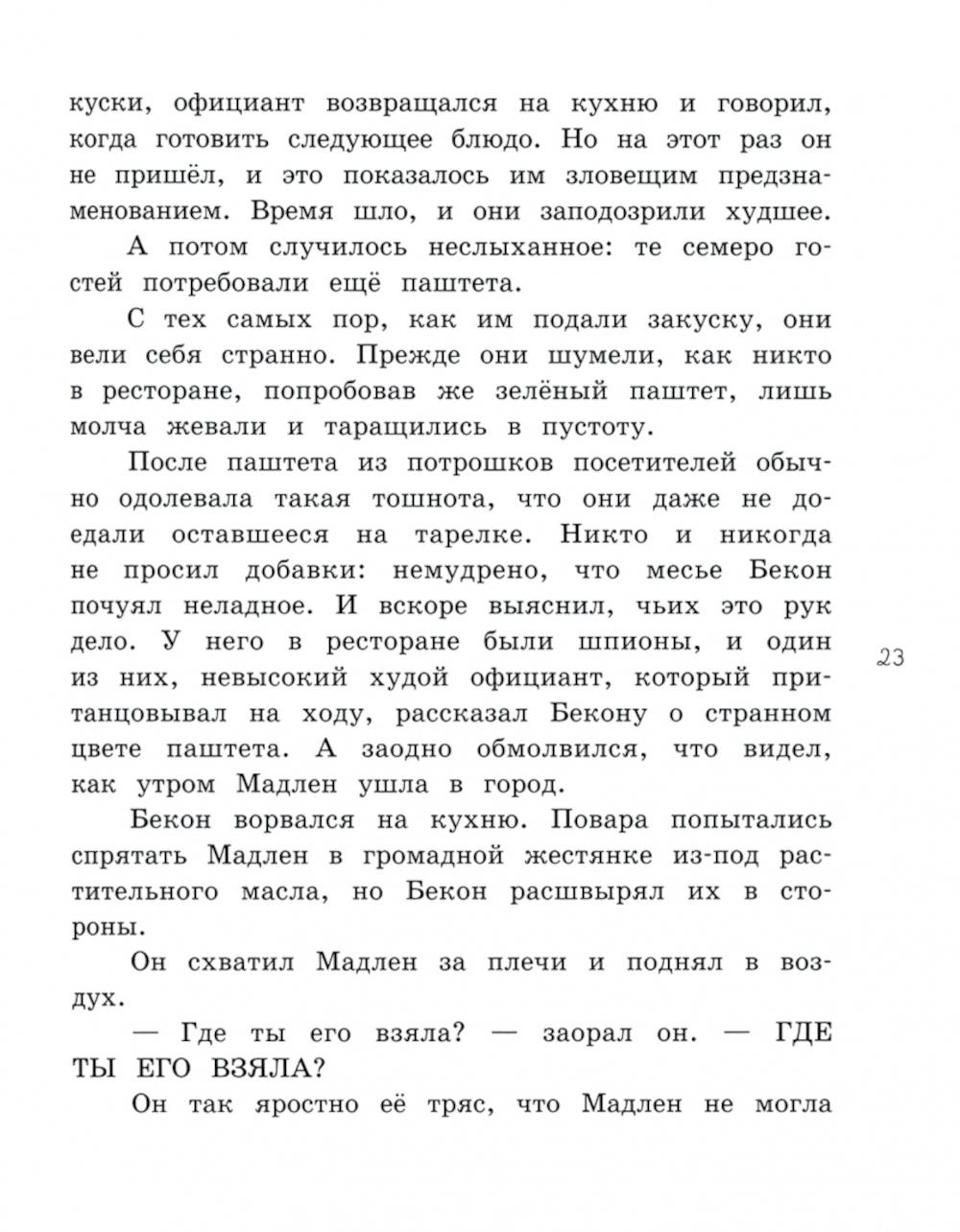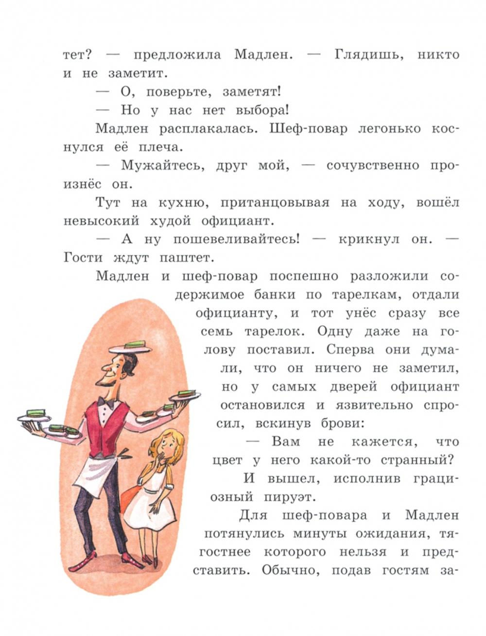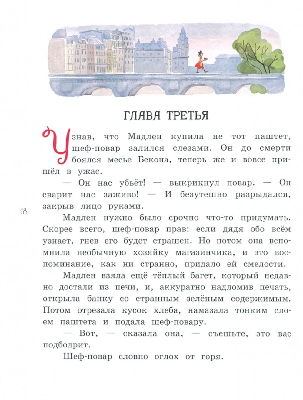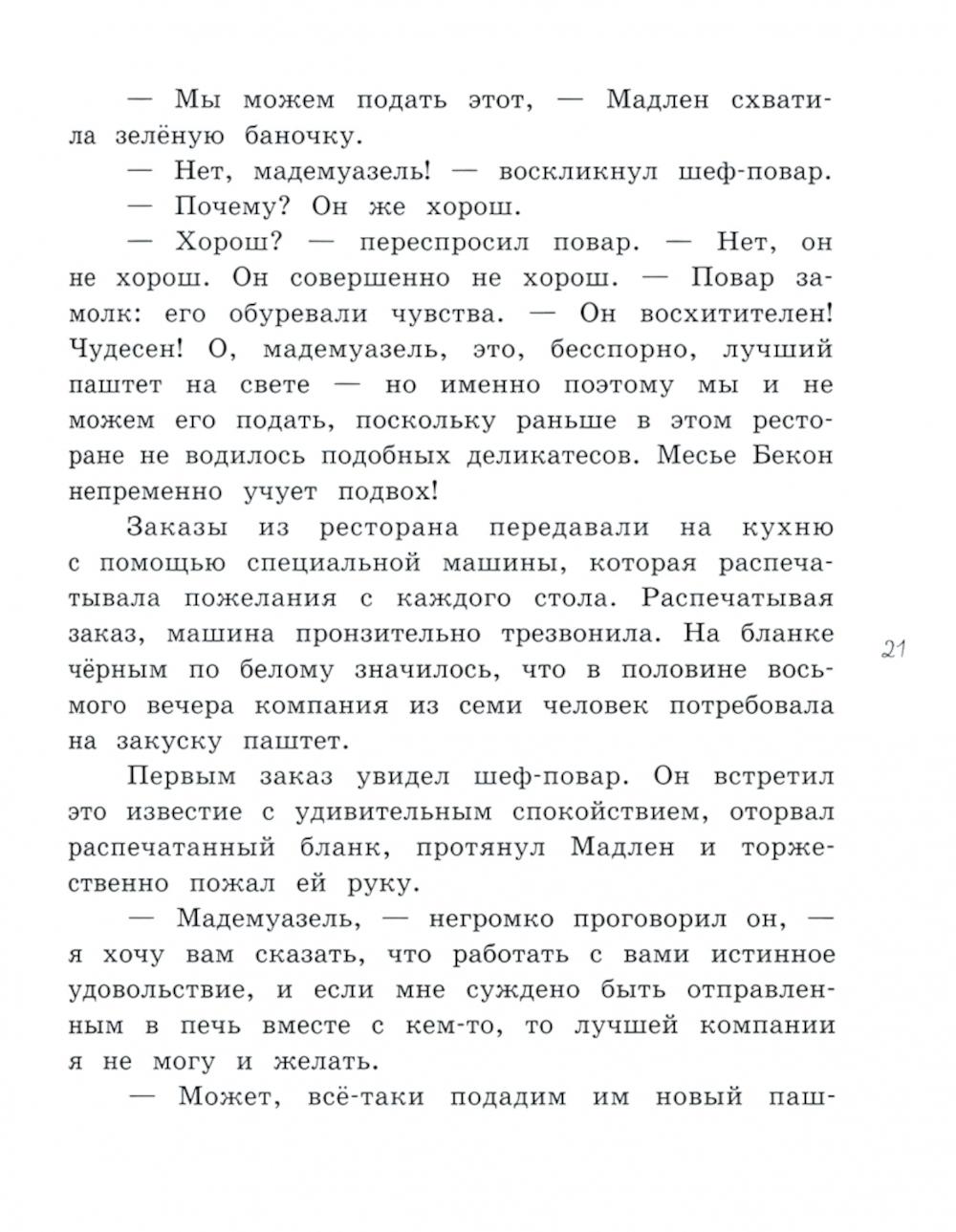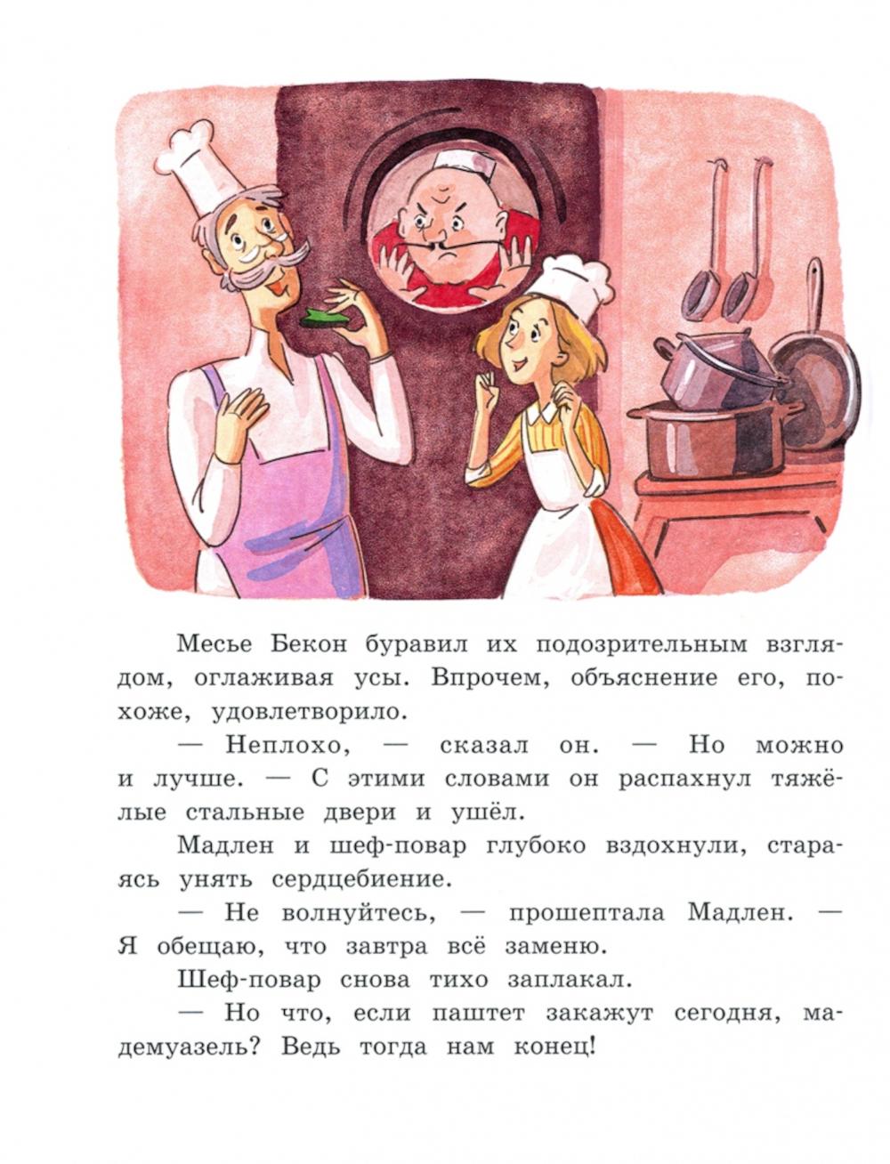 Магазинчик мадам Артишок прячется в одном из узких парижских переулков. Он неприметен снаружи, но внутри можно найти самые редкие деликатесы: салями из Минотавра, солёные хвосты велоцирапторов, паштет из североатлантического морского змея или сыры, сваренные ещё в Средние века. Хозяйка магазинчика совсем не стремится к славе - в отличие от месье Бекона, который управляет помпезным рестораном «Визжащий поросёнок». Здесь на кухне работает Мадлен - больше всего на свете она любит готовить, но ей разрешено только мыть посуду и приветливо улыбаться. Однажды на улице девочка встречает белого кота мадам Артишок и, следуя за ним, случайно попадает в магазинчик деликатесов. Так начинается история об удивительно вкусных приключениях, о призвании, зависти и дружбе. Кому понравится: всем ценителям кулинарных чудес и любителям вдохновляющих, загадочных и забавных историй. Для детей 8-12 лет.