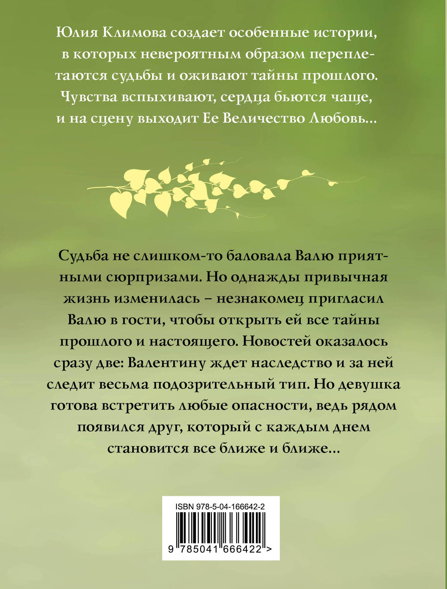 Истории Юлии Климовой - самые уютные и добрые романы о любви. Судьба не слишком-то баловала Валю приятными сюрпризами. Но однажды привычная жизнь изменилась - незнакомец пригласил Валю в гости, чтобы открыть ей все тайны прошлого и настоящего. Новостей оказалось сразу две: Валентину ждет наследство и за ней следит весьма подозрительный тип. Но девушка готова встретить любые опасности, ведь рядом появился друг, который с каждым днем становится все ближе и ближе…| Издательство | Эксмо |