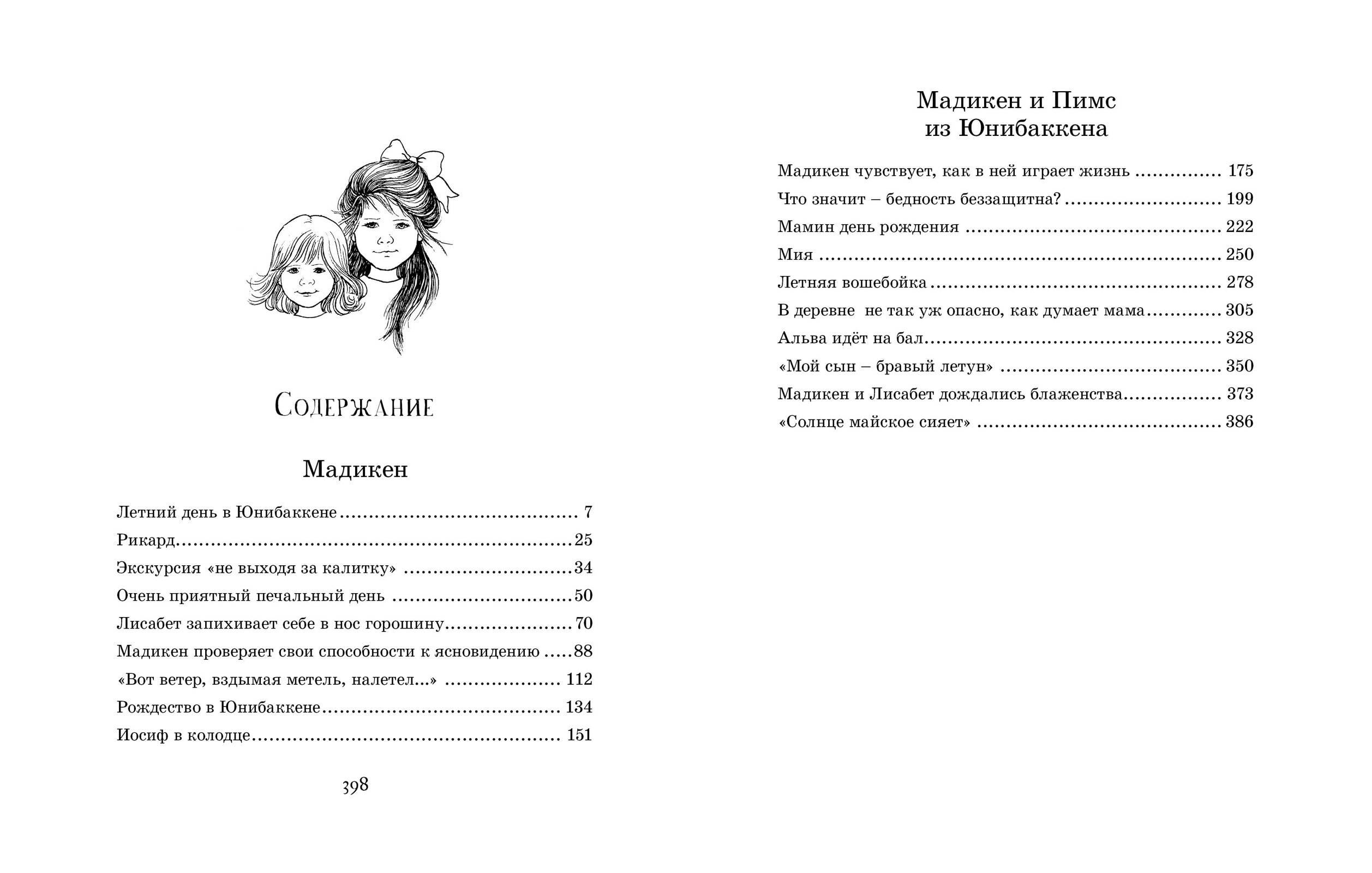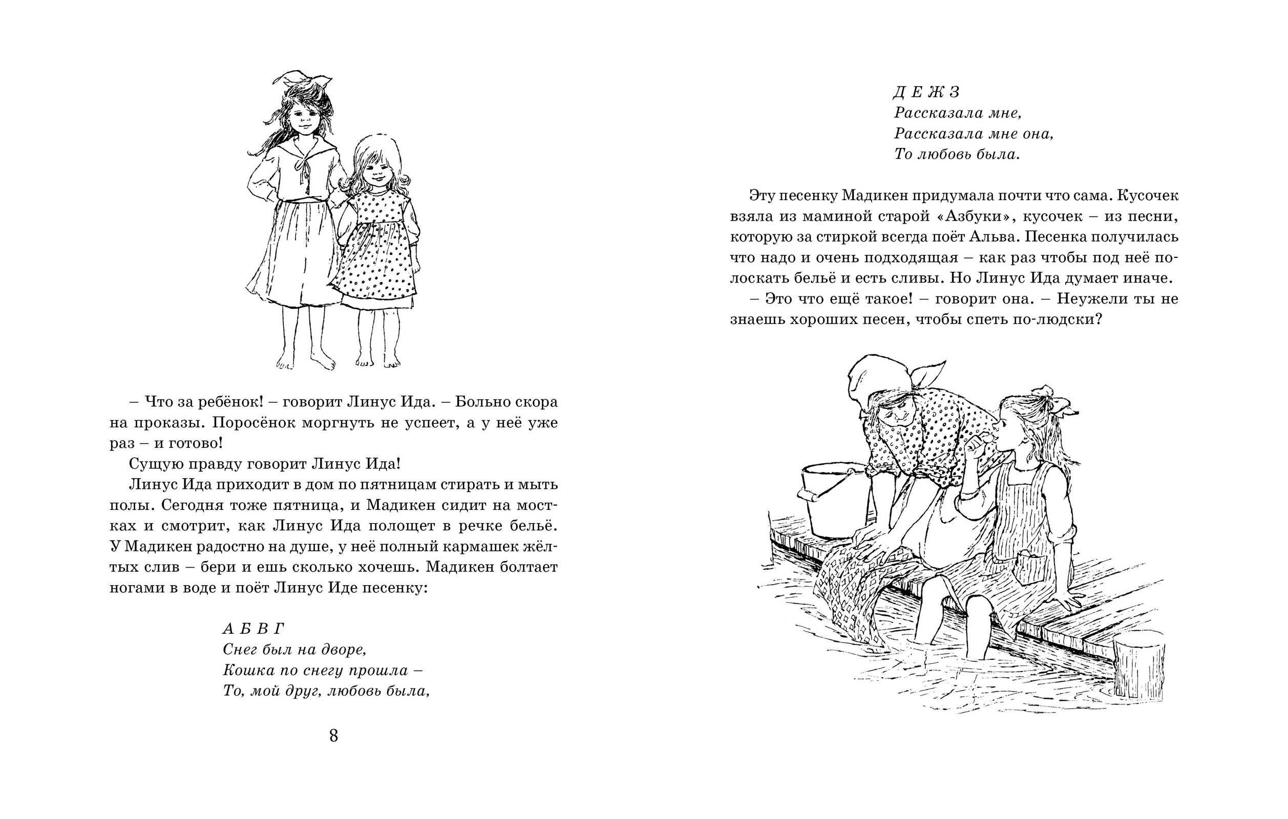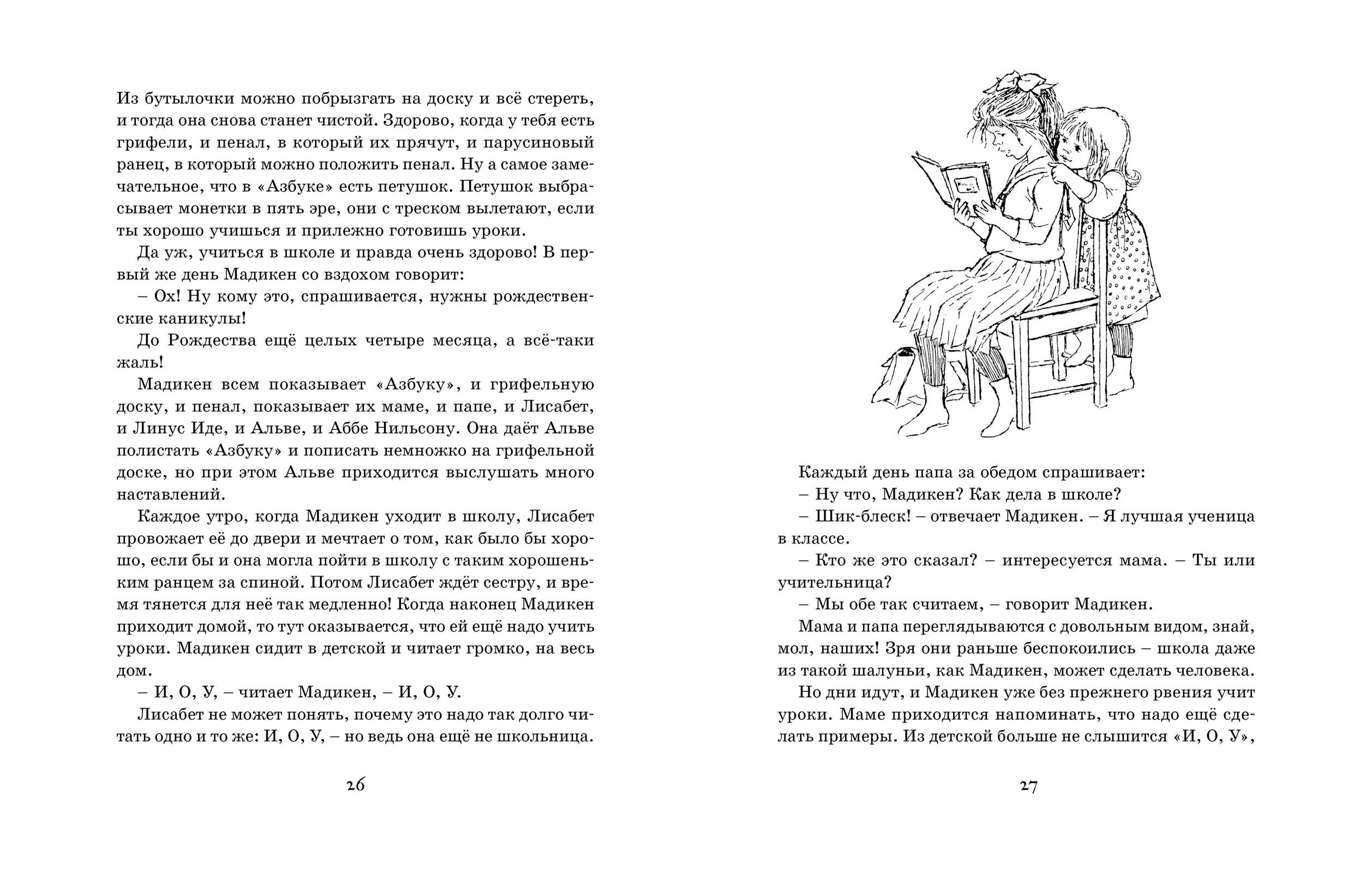Семилетняя Мадикен живёт в большом красном доме возле речки. Лучшего места, чем это, на всём свете не сыскать, считает она. Ещё там живут мама и папа, помощница Альва и малышка Пимс, которая везде и всюду следует за своей старшей сестрой. Куда одна, туда и другая. Вместе им всегда весело. Да и как может быть иначе! Ведь здесь столько всего интересного: можно купаться, качаться на качелях, играть в крокет, поливать огород и поить молоком ёжика! И всё же как трудно быть послушной девочкой! У Мадикен и Пимс ну никак не получается! Обе скоры на проказы: то упадут в прорубь, то засунут в нос горошину. Но однажды случилось такое, что и вспоминать страшно… События, описываемые в этой книге, очень напоминают те, что происходили в детстве самой Астрид Линдгрен. А одну из героинь она даже наделила собственными привычками и чертами характера. Книга пронизана юмором и тонкой иронией, которые превращают самые будничные эпизоды в захватывающее повествование.| Издательство | Азбука-Аттикус Издат.группа ООО |