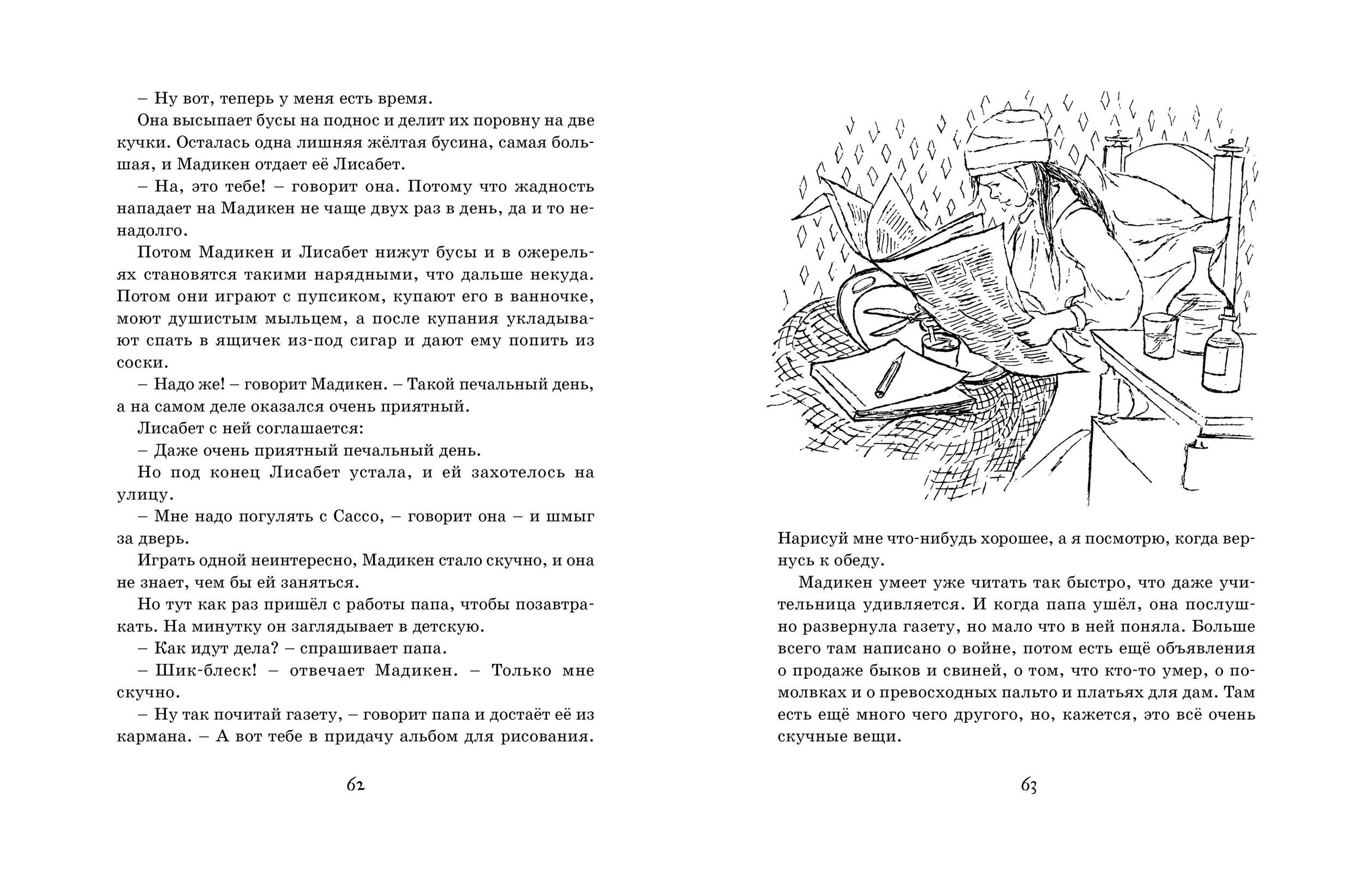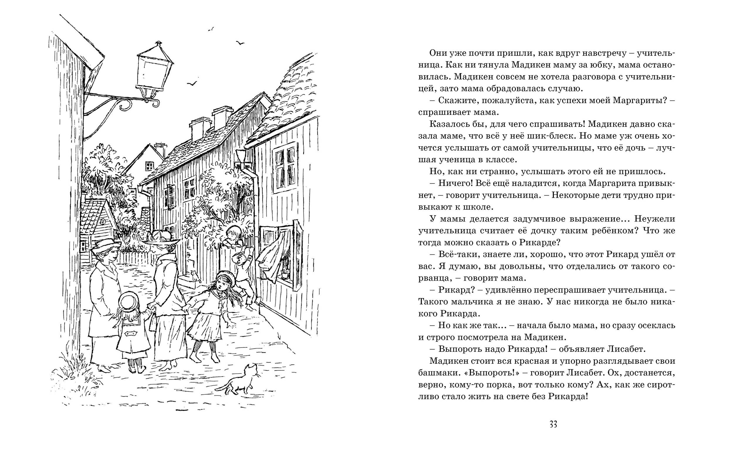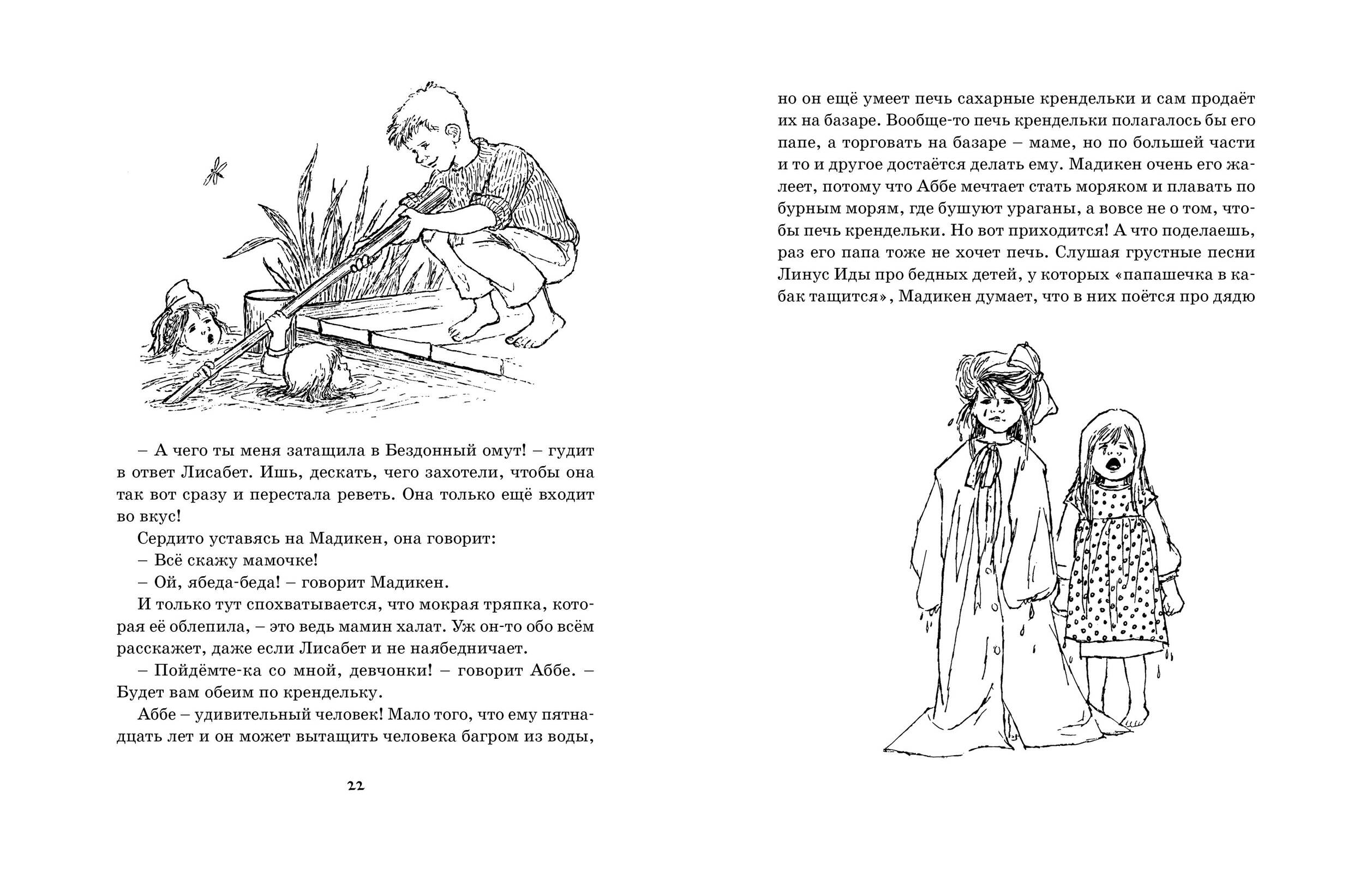 Семилетняя Мадикен живёт в большом красном доме возле речки. Лучшего места, чем это, на всём свете не сыскать, считает она. Ещё там живут мама и папа, помощница Альва и малышка Пимс, которая везде и всюду следует за своей старшей сестрой. Куда одна, туда и другая. Вместе им всегда весело. Да и как может быть иначе! Ведь здесь столько всего интересного: можно купаться, качаться на качелях, играть в крокет, поливать огород и поить молоком ёжика! И всё же как трудно быть послушной девочкой! У Мадикен и Пимс ну никак не получается! Обе скоры на проказы: то упадут в прорубь, то засунут в нос горошину. Но однажды случилось такое, что и вспоминать страшно… События, описываемые в этой книге, очень напоминают те, что происходили в детстве самой Астрид Линдгрен. А одну из героинь она даже наделила собственными привычками и чертами характера. Книга пронизана юмором и тонкой иронией, которые превращают самые будничные эпизоды в захватывающее повествование.| Издательство | Азбука-Аттикус Издат.группа ООО |