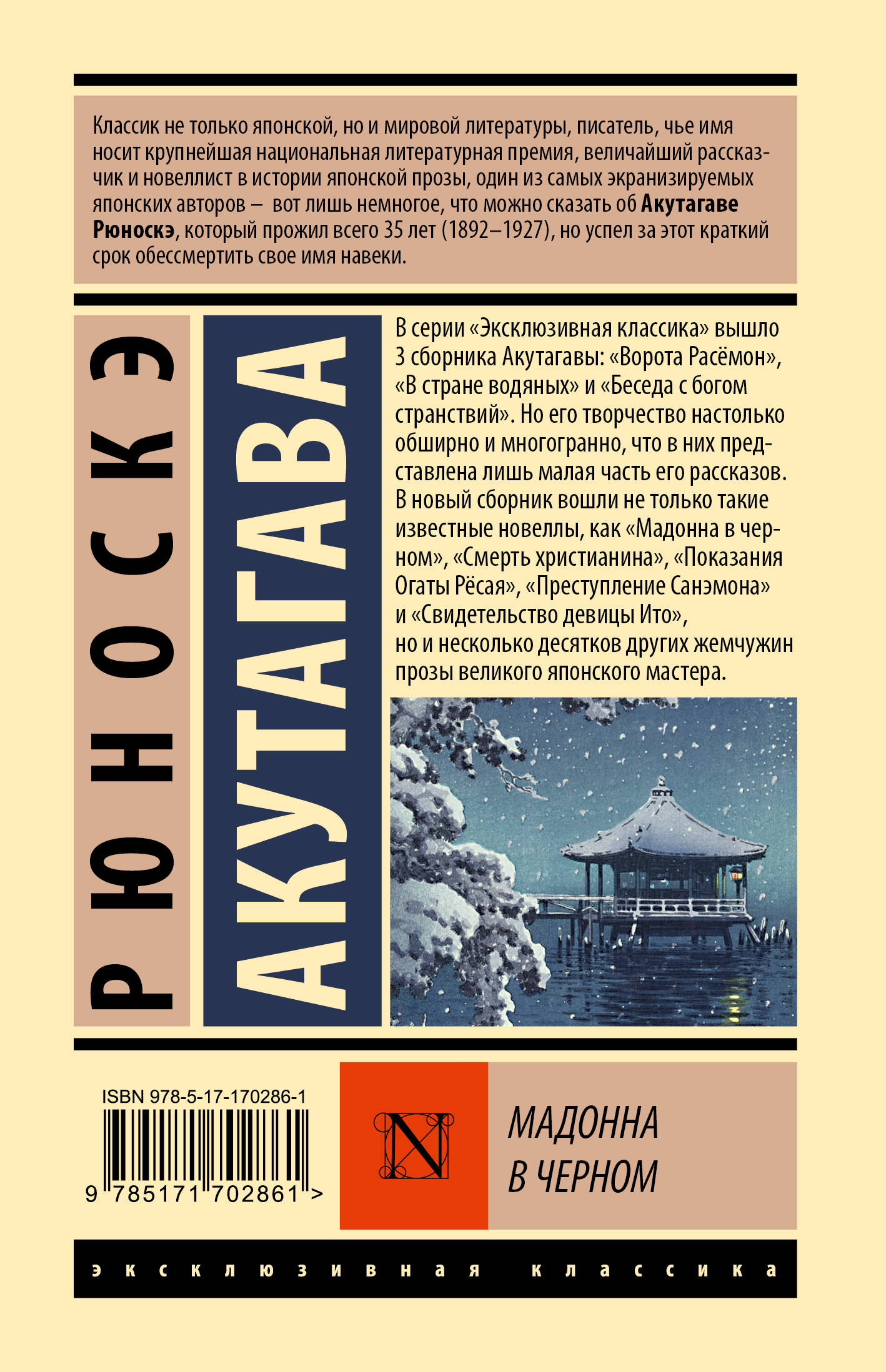 - Рюноске Акутагава - классик японской и мировой литературы. Несмотря на очень короткую жизнь, он успел создать свыше сотни рассказов и эссе, и его влияние на всю последующую японскую литературу невозможно переоценить. - Книги Акутагавы, такие как «Мадонна в черном», «Ворота Расёмон», «В стране водяных» и «Беседа с богом странствий», продолжают переиздаваться и экранизироваться, его именем названа крупнейшая японская литературная премия.| Издательство | Издательство "АСТ" |