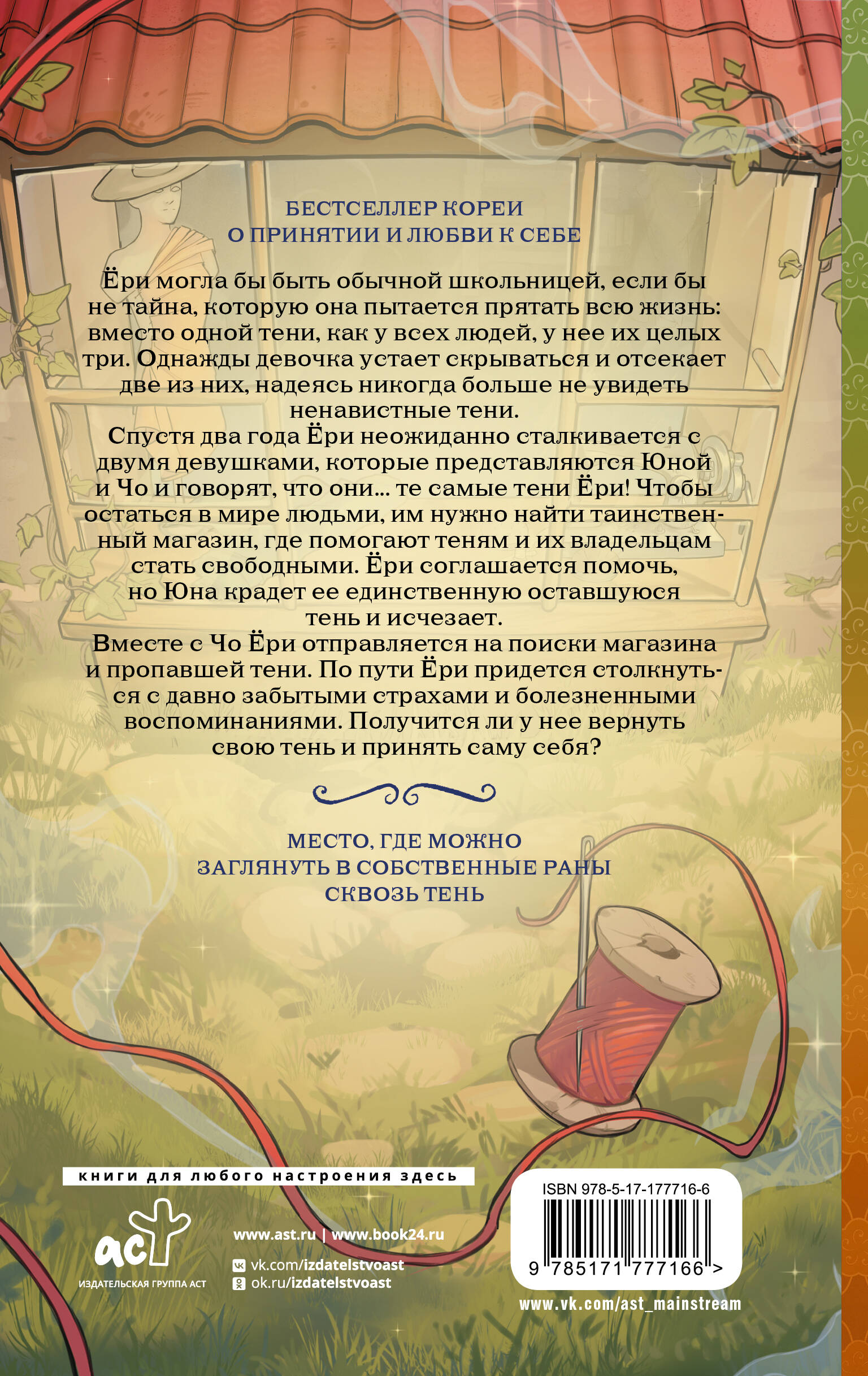 Ёри могла бы быть обычной школьницей, если бы не тайна, которую она пытается прятать всю жизнь: вместо одной тени, как у всех людей, у нее их целых три. Однажды девочка устает скрываться и отсекает две из них, надеясь никогда больше не увидеть ненавистные тени. Спустя два года Ёри неожиданно сталкивается с двумя девушками, которые представляются Юной и Чо и говорят, что они... те самые тени Ёри! Чтобы остаться в мире людьми, им нужно найти таинственный магазин, где помогают теням и их владельцам стать свободными. Ёри соглашается помочь, но Юна крадет ее единственную оставшуюся тень и исчезает. Вместе с Чо Ёри отправляется на поиски магазина и пропавшей тени. По пути им придется столкнуться с давно забытыми страхами и болезненными воспоминаниями. Получится ли у Ёри вернуть свою тень и принять саму себя?| Издательство | Издательство "АСТ" |