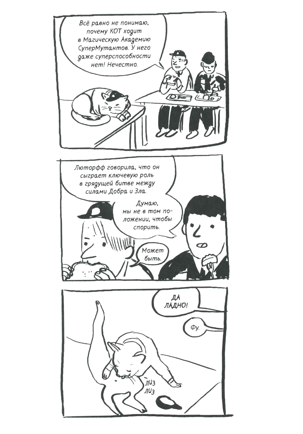 Войдите в не-такие-уж-и-священные залы Магической Академии Супермутантов, и пусть вас накроет волной подростковой апатии. Венди, Марша, Чеддер, Фрэнсис и другие ученики будут вашими проводниками в мире игр D&D, арт-перформансов, неразделённой любви, тестов и экзаменов, - ведь это основы жизни в школе паранормальных подростков, впрочем, как и в любой другой школе. Канадская художница Джиллиан Тамаки создала абсурдный и язвительный комикс, который одновременно рассмешит вас до слёз и заставит серьёзно задуматься над вечными вопросами человечества.| Издательство | КомФест/Три девять |