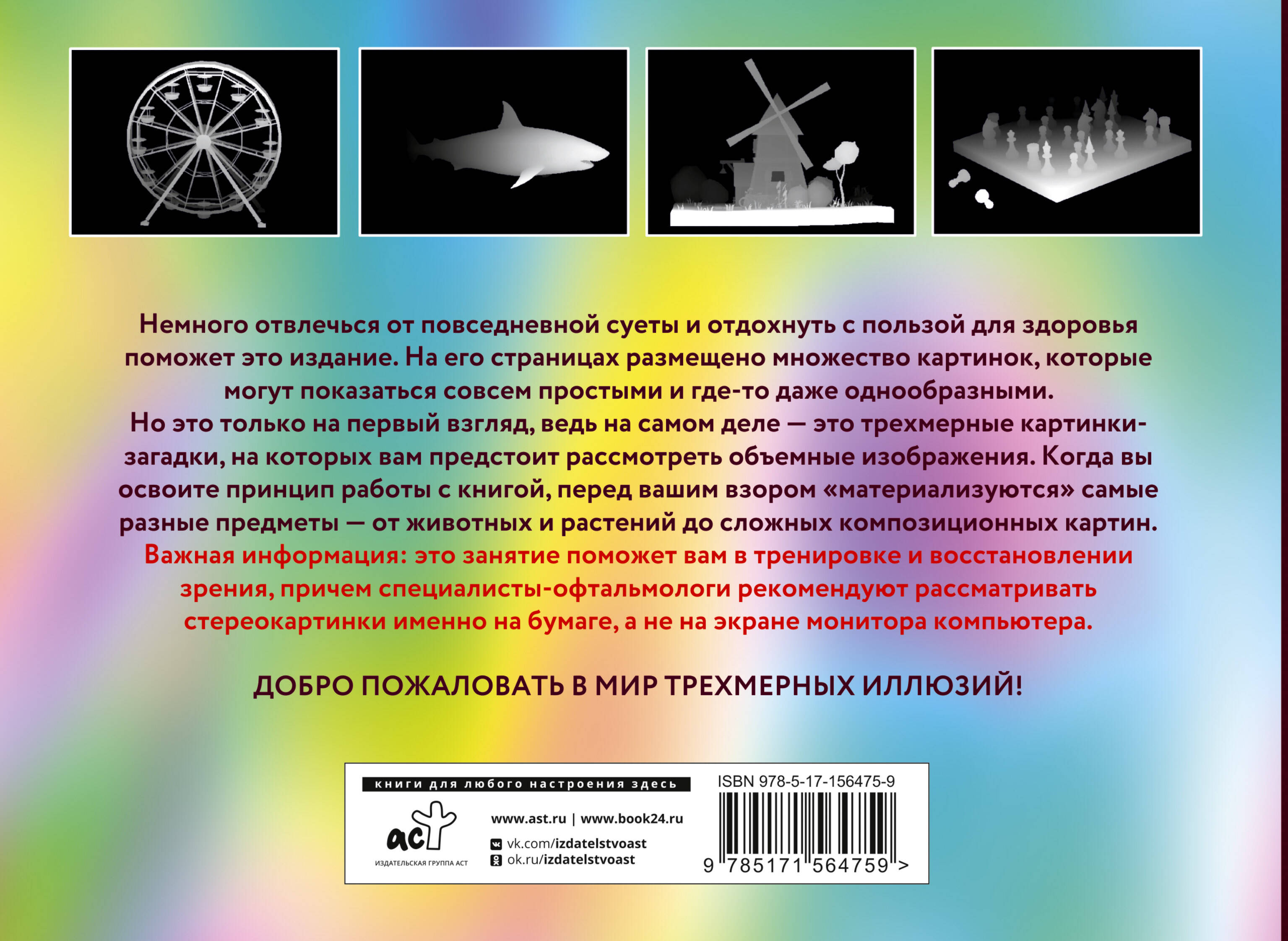 Немного отвлечься от повседневной суеты и отдохнуть с пользой для здоровья поможет это издание. На его страницах размещено множество картинок, которые могут показаться совсем простыми и где-то даже однообразными. Но это только на первый взгляд, ведь на самом деле - это трехмерные картинки-загадки, на которых вам предстоит рассмотреть объемные изображения. Когда вы освоите принцип работы с книгой, перед вашим взором "материализуются" самые разные предметы - от животных и растений до сложных композиционных картин. Приятный бонус - отрывные страницы! У вас есть возможность не только самостоятельно изучить альбом, но и поделиться понравившимися картинками с друзьями и близкими, сделать полезный и необычный подарок, используя их в качестве открыток. Разобрав книгу на страницы, вы можете также устроить увлекательную игру в компании, угадывая кто или что скрывается в пёстром узоре.| Издательство | ИЗДАТЕЛЬСТВО "АСТ" |