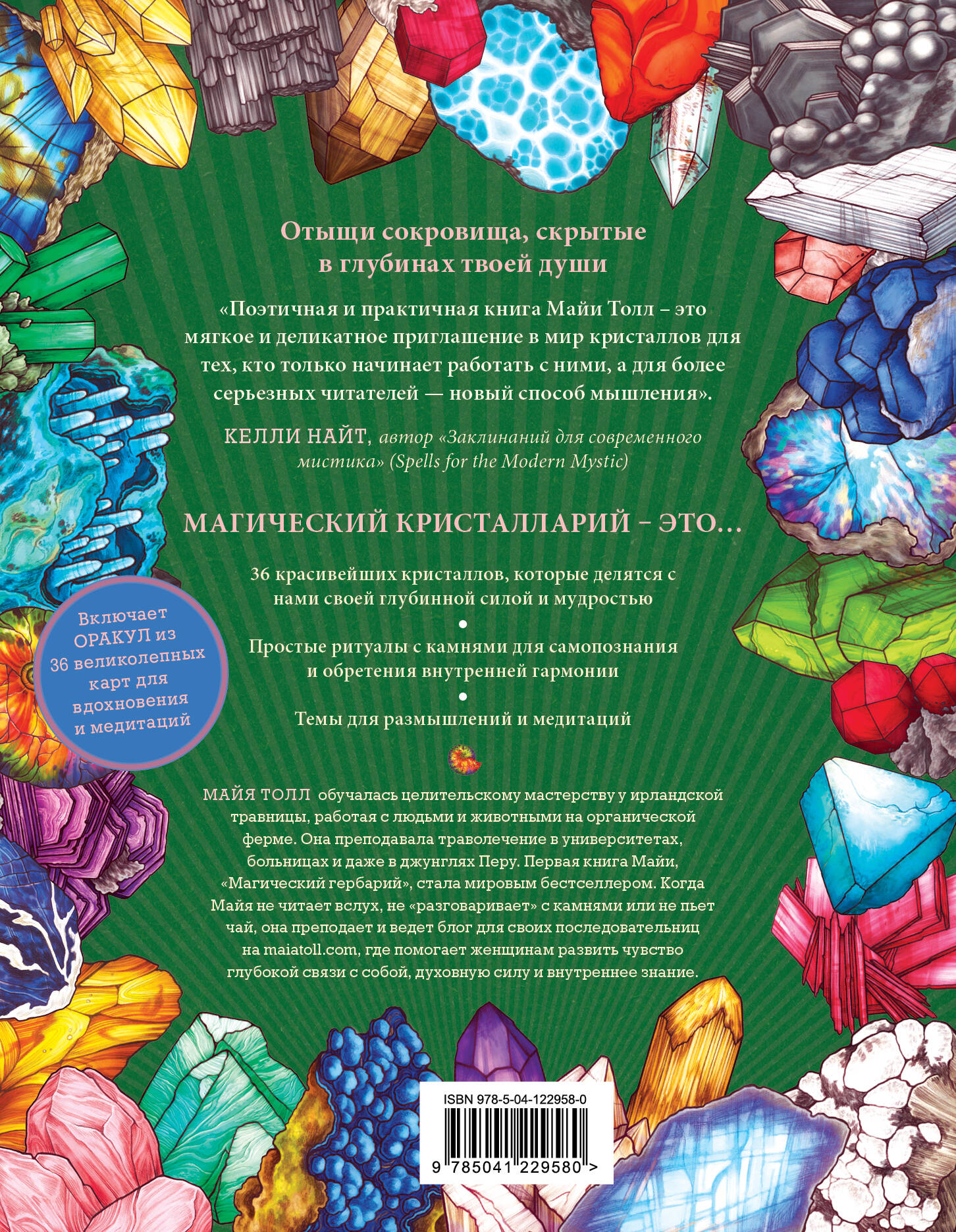Откройте для себя силу и мудрость кристаллов с новой книгой Майи Толл, автора красочного бестселлера «Магический гербарий»! В ней автор исследует мистические свойства 36 самых известных камней и кристаллов, включая аметист, гематит, слюду, дымчатый кварц, изумруд, рубин и многие другие. Сочетая мудрость древних со своими собственными открытиями и прозрениями, Майя Толл описывает свойства и энергии каждого кристалла и делится ритуалами и медитациями, которые помогут лучше понять природу каждого камня - и самих себя, свои истинные желания и цели. МАГИЧЕСКИЙ КРИСТАЛЛАРИЙ - ЭТО… • 36 красивейших кристаллов, которые делятся с нами своей глубинной силой и мудростью. • Простые ритуалы с камнями для самопознания и обретения внутренней гармонии. • Темы для размышлений и медитаций. • ОРАКУЛ из 36 карт с невероятными иллюстрациями Кейт О`Хары. МАЙЯ ТОЛЛ обучалась целительскому мастерству у ирландской травницы, работая с людьми и животными на органической ферме. Она преподавала траволечение в университетах, больницах и даже в джунглях Перу. Первая книга Майи, «Магический гербарий», стала мировым бестселлером. Когда Майя не читает вслух, не «разговаривает» с камнями или не пьет чай, она преподает и ведет блог для своих последовательниц на maiatoll.com, где помогает женщинам развить чувство глубокой связи с собой, духовную силу и внутреннее знание. «Поэтичная и практичная книга Майи Толл - это мягкое и деликатное приглашение в мир кристаллов для тех, кто только начинает работать с ними, а для более серьезных читателей - новый способ мышления». - Келли Найт, автор «Заклинаний для современного мистика» (Spells for the Modern Mystic)| Издательство | ООО "Издательство "Эксмо" |