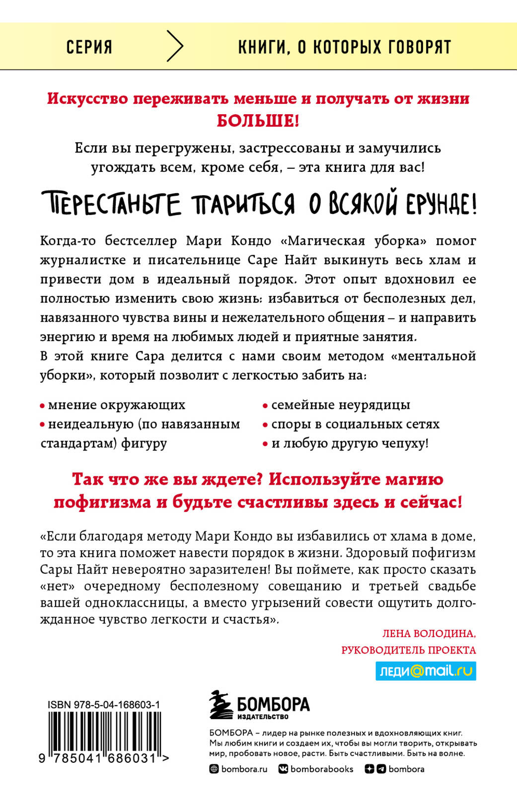 Когда-то бестселлер Мари Кондо «Магическая уборка» помог журналистке и писательнице Саре Найт выкинуть весь хлам и привести дом в идеальный порядок. Этот опыт вдохновил ее полностью изменить свою жизнь: избавиться от бесполезных дел, навязанного чувства вины и нежелательного общения - и направить энергию и время на любимых людей и приятные занятия. В своей книге Сара делится с нами своим методом «ментальной уборки», который позволит с легкостью забить на: - мнение окружающих; - неидеальную (по навязанным стандартам) фигуру; - семейные неурядицы; - споры в в социальных сетях; - и любую другую чепуху!| Издательство | Эксмо |