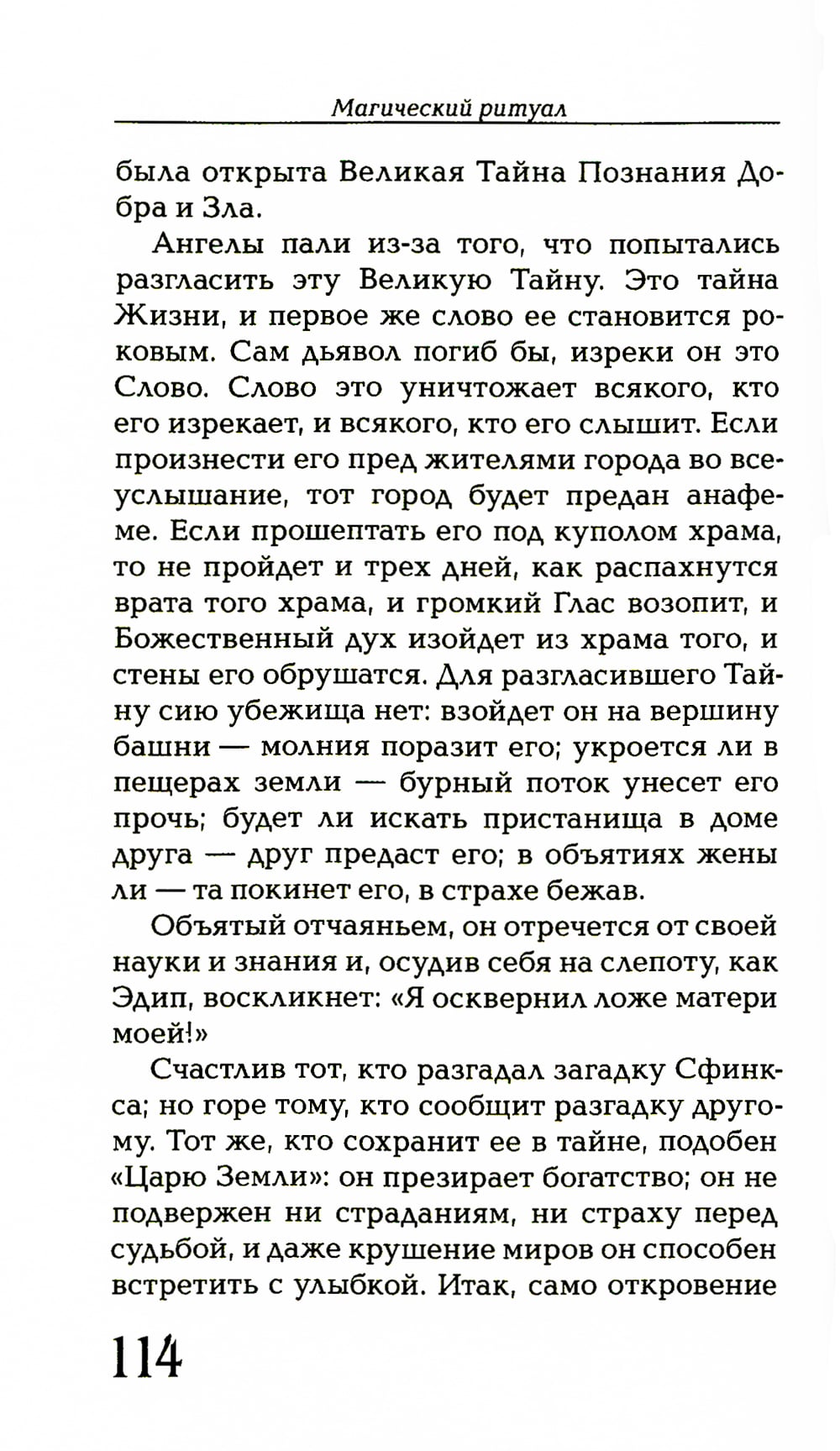 «Магический ритуал Sanctum Regnum» раскрывает тайные символические значения Старших арканов Таро, представляя их последовательность как описание самого важного из всех магических ритуалов - великого посвятительного пути, которым маг движется к обретению Sanctum Regnum, сокровенного Царства Божия. Помимо раскрытия магического и инициатического смысла арканов, трактат содержит личные наставления Леви его ученику и описания магических практик, помогающих исполнить эту Великую Работу. Издание предварено двумя введениями - Р.А. Гилберта (известного английского историка оккультных организаций) и У.У. Уэсткотта (одного из основателей Герметического ордена Золотой Зари). Каждая глава сопровождается подробными комментариями Уэсткотта.| Издательство | Энигма |