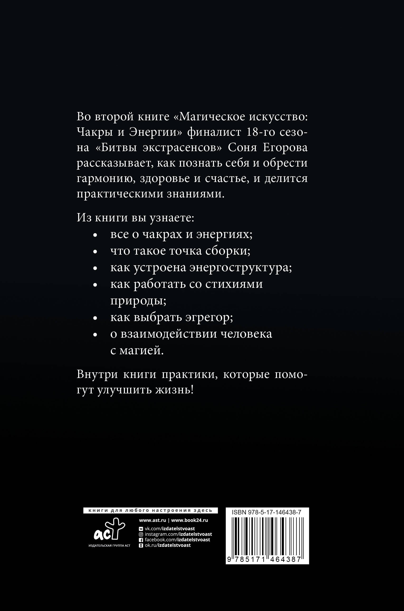 Во второй книге «Магическое искусство: Чакры и Энергии» финалист 18-го сезона «Битвы экстрасенсов» Соня Егорова рас- сказывает, как познать себя и обрести гармонию, здоровье и сча- стье, и делится практическими знаниями. Из книги вы узнаете: все о чакрах и энергиях; что такое точка сборки; как устроена энергоструктура; как работать со стихиями природы; как выбрать эгрегор; о взаимодействии человека с магией. Внутри книге практики, которые помогут улучшить жизнь!| Издательство | ИЗДАТЕЛЬСТВО "АСТ" |