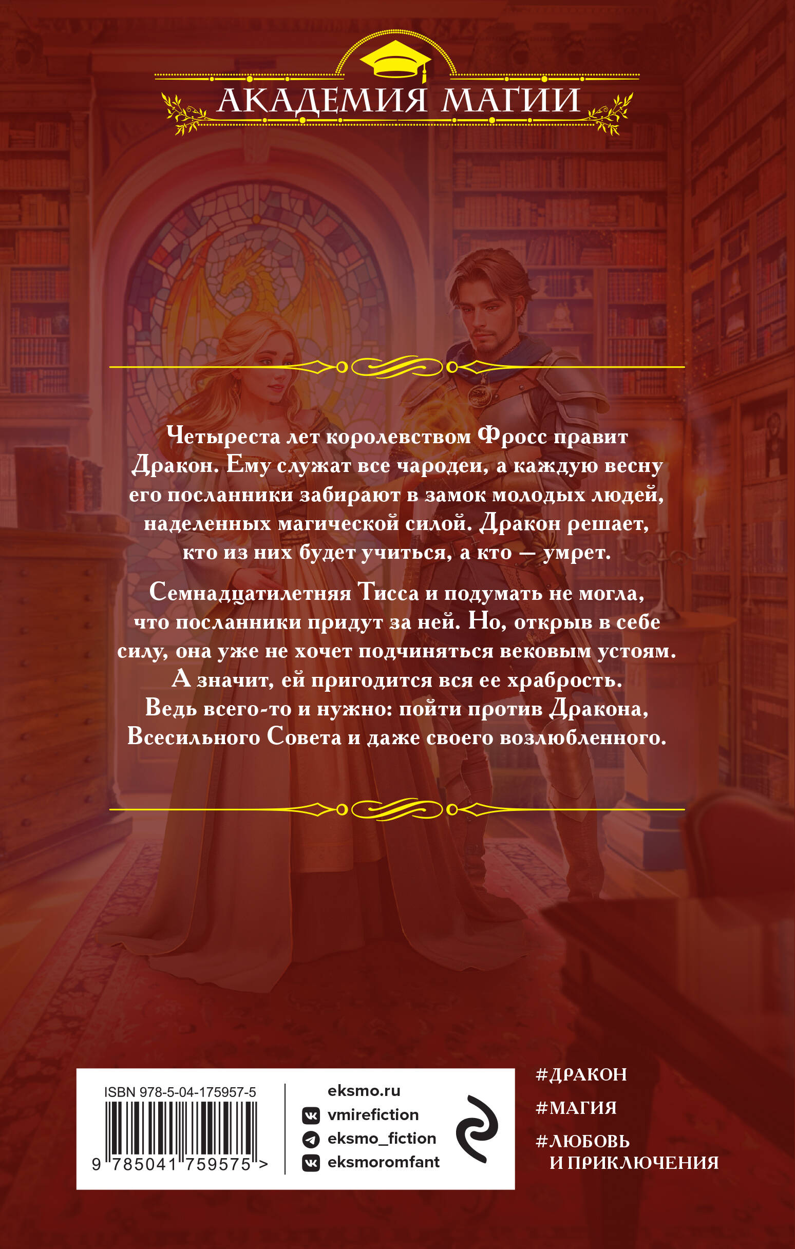 Четыреста лет королевством Фросс правит Дракон. Ему служат все чародеи, а каждую весну его посланники забирают в замок молодых людей, наделенных магической силой. Дракон решает, кто из них будет учиться, а кто - умрет. Семнадцатилетняя Тисса и подумать не могла, что посланники придут за ней. Но открыв в себе силу, она уже не хочет подчиняться вековым устоям. А значит, ей пригодится вся ее храбрость. Ведь всего-то и нужно: пойти против Дракона, Всесильного Совета и даже своего возлюбленного. 1. Девушка, отданная на расправу дракону, академия магии и суровый красавец-маг - ингредиенты уже известны. Как приготовить из них что-то необычное? Эта книга сумеет вас удивить! 2. История пропитана юмором и магией - настоящая взрывная смесь. Вот на вас когда-нибудь смотрел со злым прищуром маленький, но очень сердитый слизень? 3. Яркие герои. Непредсказуемая Тисса, самодовольный Мельхикор, скрывающая собственные тайны Аравель и усатый Сильверон - у каждого свои мотивы и своя история. 4. Драконы. Красивые, коварные и почти непобедимые. Хотя при первой встрече с правителем королевства Тиссе удалось дать ему в глаз. 5. Авторский мир. На страницах книги отлично уживаются и воинственные горцы, и величественные снежные барсы, и одна довольно занудная сова.| Издательство | ООО "Издательство "Эксмо" |