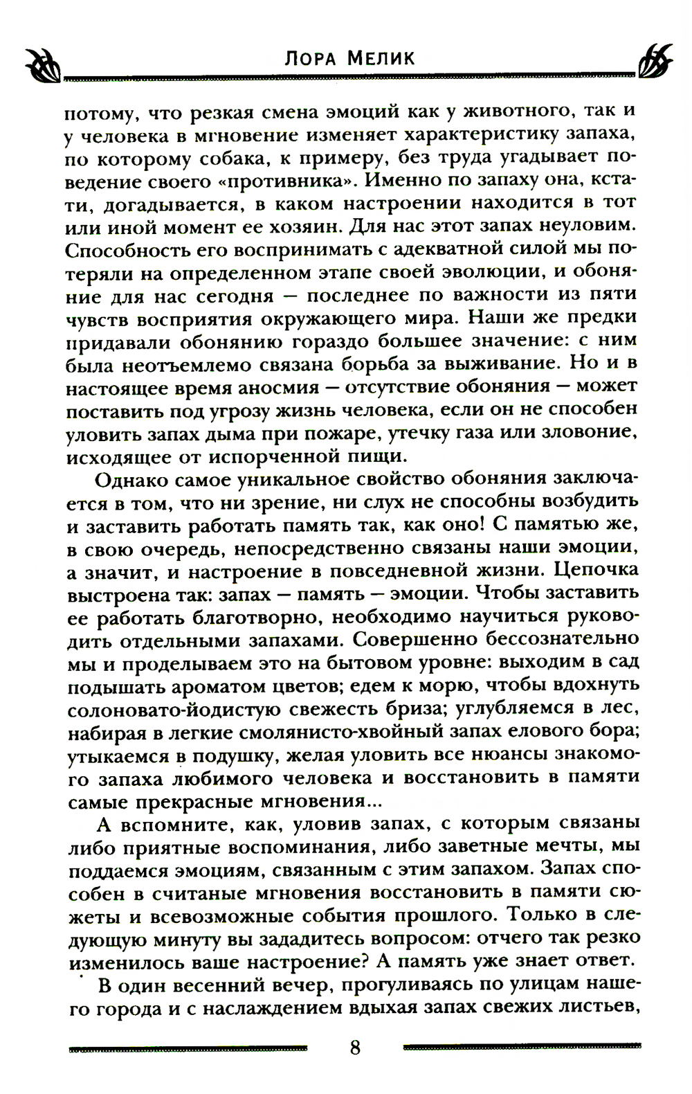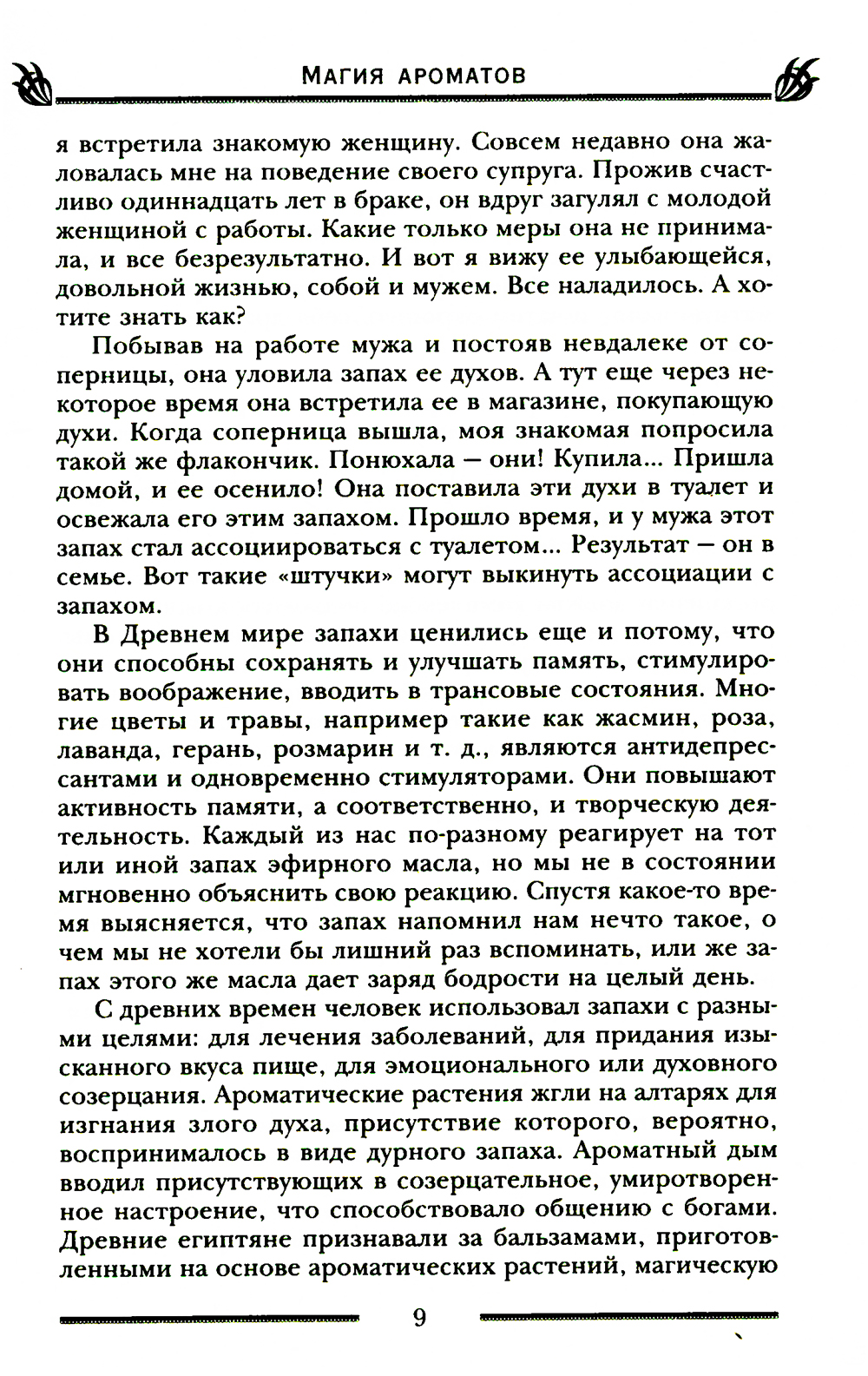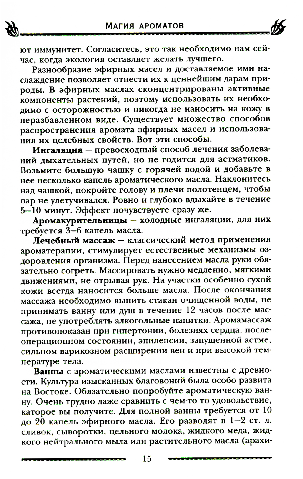 Бесконечно огромна кладовая матушки-природы. Она одаривает нас травами, цветами, плодами, а волшебное благоухание растений может потягаться в эффективности с целебными настоями и отварами. Добываемые из лечебных растений эфирные масла пригодятся везде: ароматизировать помещение, сделать духи, шампунь, маску для лица, массажное масло, ингаляцию, принять расслабляющую ванну или тонизирующий душ. Запахи воздействуют напрямую на центральную нервную систему и могут творить чудеса, избавляя от болезней, стресса, напряжения, бессонницы, улучшая настроение и повышая работоспособность. У знаков зодиака и цветов радуги тоже есть соответствующие им запахи, как и у влияющих на вашу жизнь планет. Главное - подобрать аромат, который подойдет лично вам, подарит радость и окажет положительное магическое влияние на вашу жизнь, в чем и поможет эта книга.
