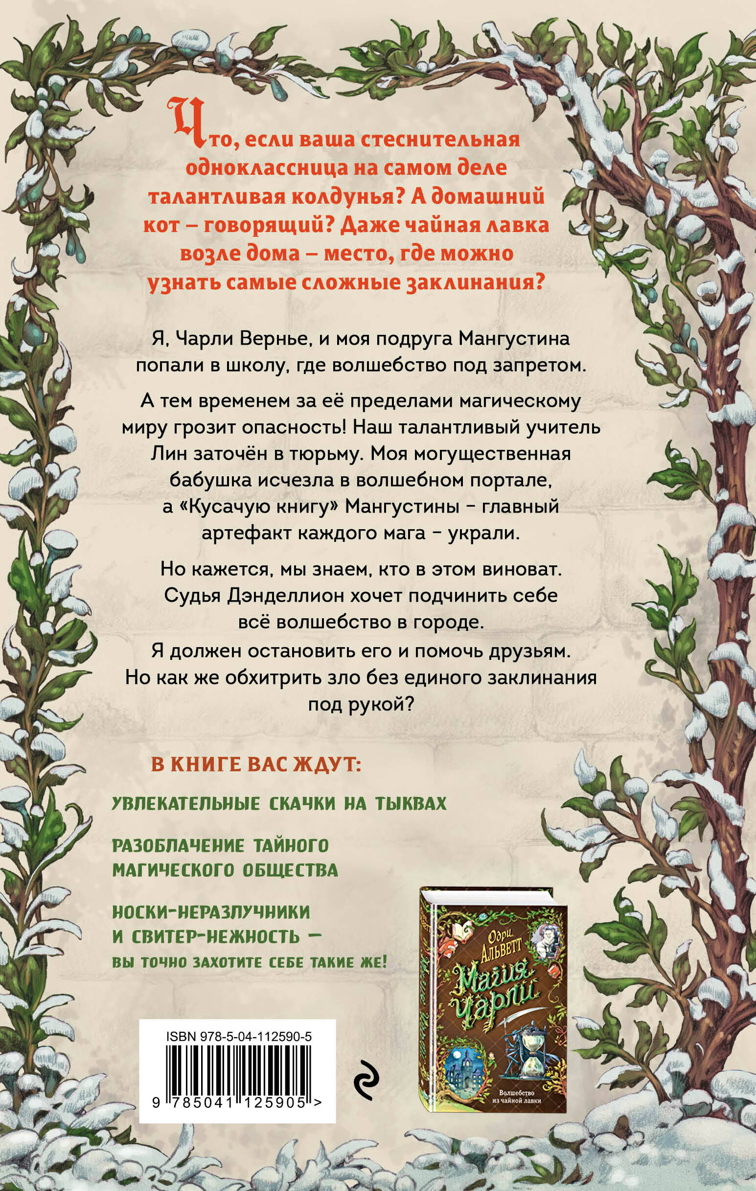 Продолжение потрясающей фэнтези-трилогии «Магия Чарли»! Чарли Вернье и его подруга Мангустина попали в школу, где волшебство под запретом. А тем временем за её пределами магическому миру грозит опасность! Их талантливый учитель Лин заточён в тюрьме. Могущественная бабушка Чарли исчезла в волшебном портале, а «Кусачую книгу» Мангустины - главный артефакт каждого мага - украли. Но, кажется, они знают, кто в этом виноват. Судья Дэнделлион хочет подчинить себе всё волшебство в городе. Чарли должен остановить его и помочь друзьям. Но как же обхитрить зло без единого заклинания под рукой? Книга входит в ТОП-100 фэнтези для подростков на Амазоне. Яркие иллюстративные форзацы и леттеринг от популярной художницы Пичи. Волшебные чёрно-белые виньетки в блоке передают магическую атмосферу книги. Идеально для читателей 10-14 лет!| Издательство | ООО "Издательство "Эксмо" |
