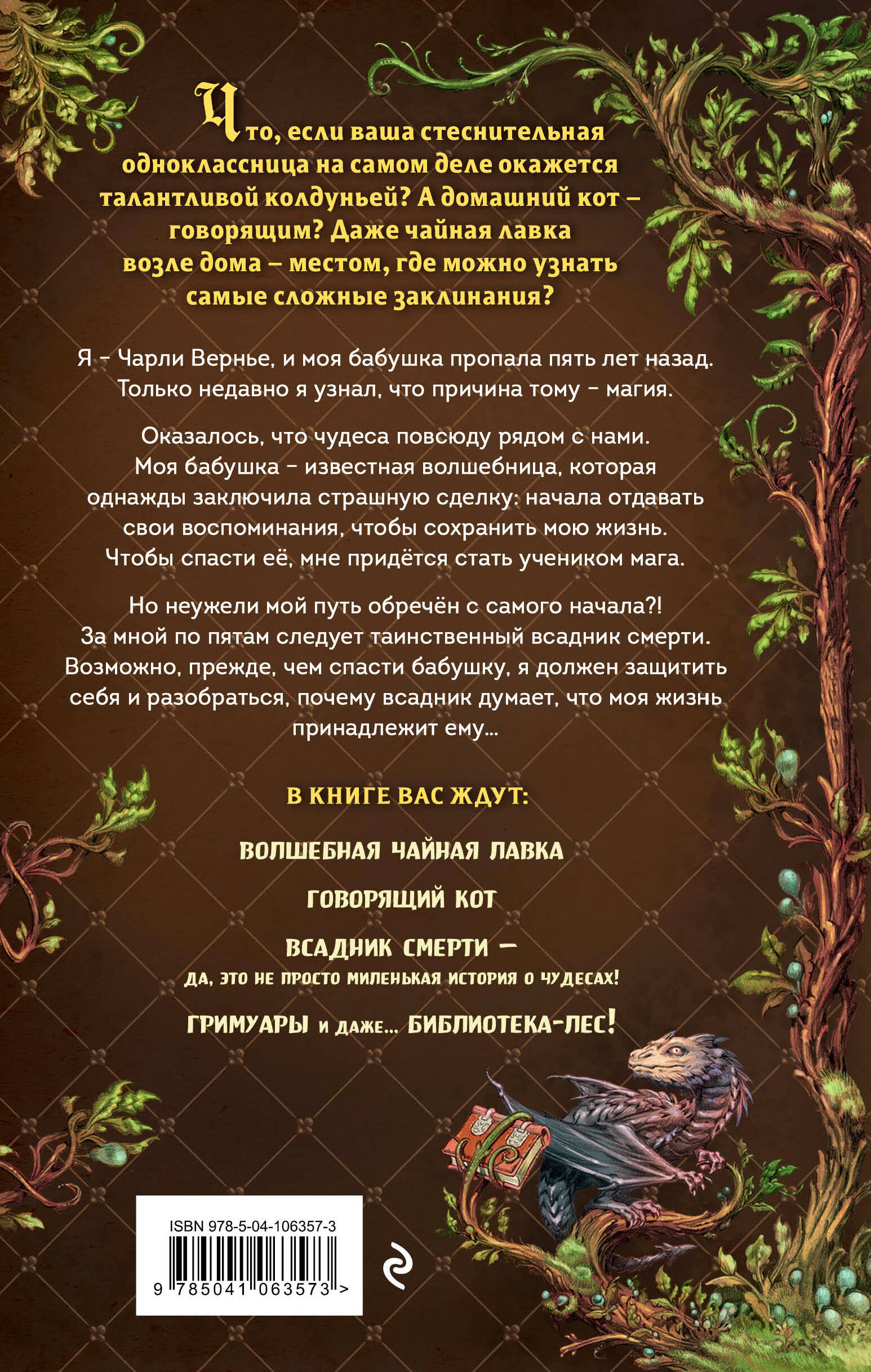 Новинка! Фэнтези-трилогия: магия и волнующие каждого подростка вопросы. Что, если ваша стеснительная одноклассница на самом деле окажется талантливой колдуньей? А домашний кот - говорящим? Даже чайная лавка возле дома - местом, где можно узнать самые сложные заклинания? Я - Чарли Вернье, и моя бабушка пропала пять лет назад. Только недавно я узнал, что причина тому - магия. Оказалось, что чудеса повсюду рядом с нами. Моя бабушка - известная волшебница, которая однажды заключила страшную сделку - начала отдавать свои воспоминания, чтобы сохранить мою жизнь. Чтобы спасти её, мне придётся стать учеником мага. Но неужели мой путь обречён с самого начала?! За мной по пятам следует таинственный всадник смерти. Возможно, прежде чем спасти бабушку, я должен защитить себя и разобраться, почему всадник думает, что моя жизнь принадлежит ему… Для фанатов ярких характеров и трогательного юмора в духе Пратчетта и Геймана. Ближайший аналог в нише - «Девочка, которая не видела снов». Книга входит в ТОП-100 фэнтези для подростков на Амазоне. Завораживающая, детально проработанная обложка от потрясающего французского иллюстратора Стэна Манюкяна, мастера рисования фэнтезийных существ. Яркие иллюстративные форзацы и леттеринг от популярной художницы Пичи. Волшебные чёрно-белые виньетки в блоке передают магическую атмосферу книги. Идеально для читателей 10-15 лет!| Издательство | ООО "Издательство "Эксмо" |