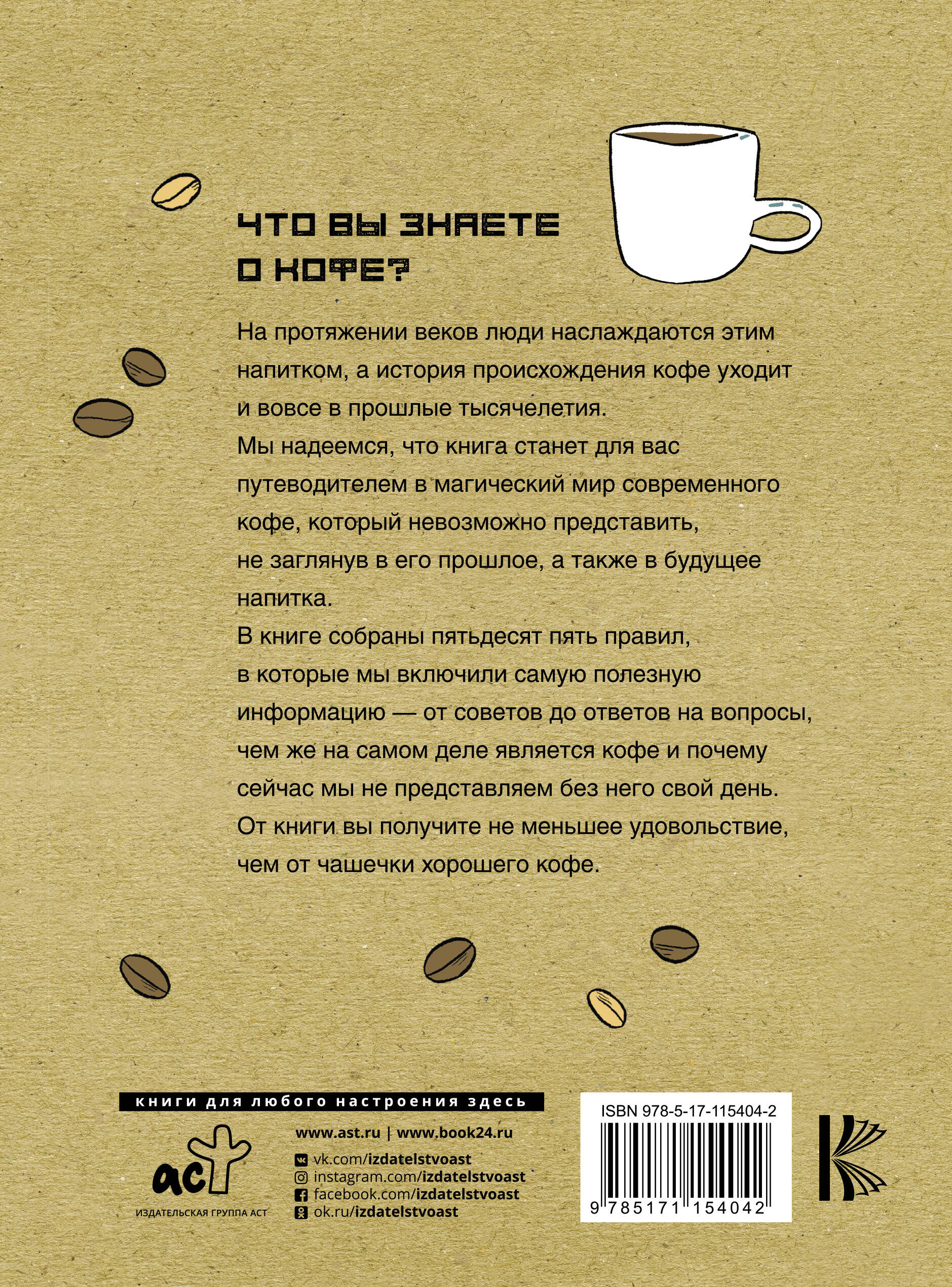 Что вы знаете о кофе? На протяжении веков люди наслаждаются этим напитком, а история происхождения кофе уходит и вовсе в прошлые тысячелетия. Мы надеемся, что книга станет для вас путеводителем в магический мир современного кофе, который невозможно представить, не заглянув в его прошлое, а также в будущее напитка. В книге собраны пятьдесят пять правил, в которые мы включили самую полезную информацию - от советов до ответов на вопросы, чем же на самом деле является кофе и почему сейчас мы не представляем без него свой день. От книги вы получите не меньшее удовольствие чем от чашечки хорошего кофе.| Издательство | Издательство "АСТ" |