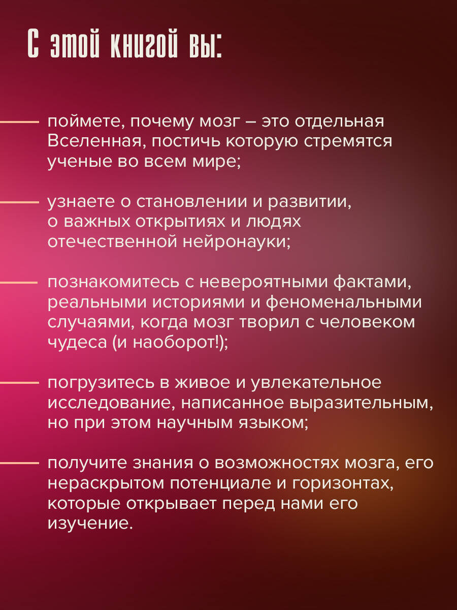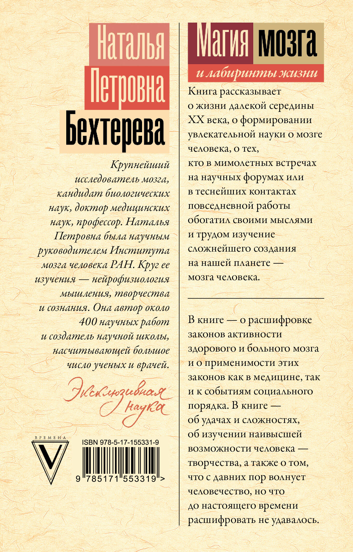 Наталья Петровна Бехтерева - крупнейший исследователь мозга, кандидат биологических наук, доктор медицинских наук, профессор. Наталья Петровна была научным руководителем Института мозга человека РАН. Круг ее изучения - нейрофизиология мышления, творчества и сознания. Она автор около 400 научных работ и создатель научной школы, насчитывающей большое число ученых и врачей. Книга "Магия мозга и лабиринты жизни" рассказывает о жизни далекой середины XX века, о формировании увлекательной науки о мозге человека, о тех, кто в мимолетных встречах на научных форумах или в теснейших контактах повседневной работы обогатил своими мыслями и трудом изучение сложнейшего создания на нашей планете - мозга человека. В книге "Магия мозга и лабиринты жизни" - о расшифровке законов активности здорового и больного мозга и о применимости этих законов как в медицине, так и к событиям социального порядка. В книге - об удачах и сложностях, об изучении наивысшей возможности человека - творчества, а также о том, что с давних пор волнует человечество, но что до настоящего времени расшифровать не удавалось.| Издательство | ИЗДАТЕЛЬСТВО "АСТ" |