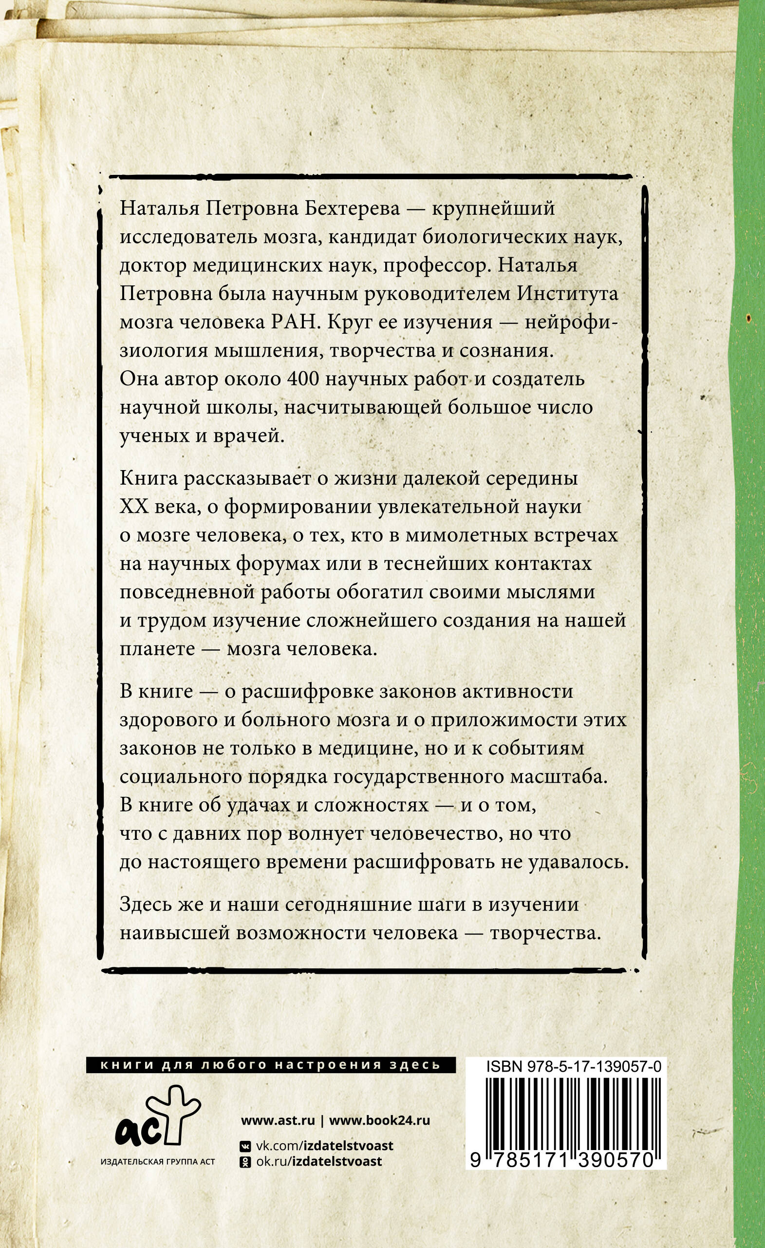 Наталья Петровна Бехтерева - крупнейший исследователь мозга, кандидат биологических наук, доктор медицинских наук, профессор. Наталья Петровна была научным руководителем Института мозга человека РАН. Круг ее изучения - нейрофизиология мышления, творчества и сознания. Она автор около 400 научных работ и создатель научной школы, насчитывающей большое число ученых и врачей.