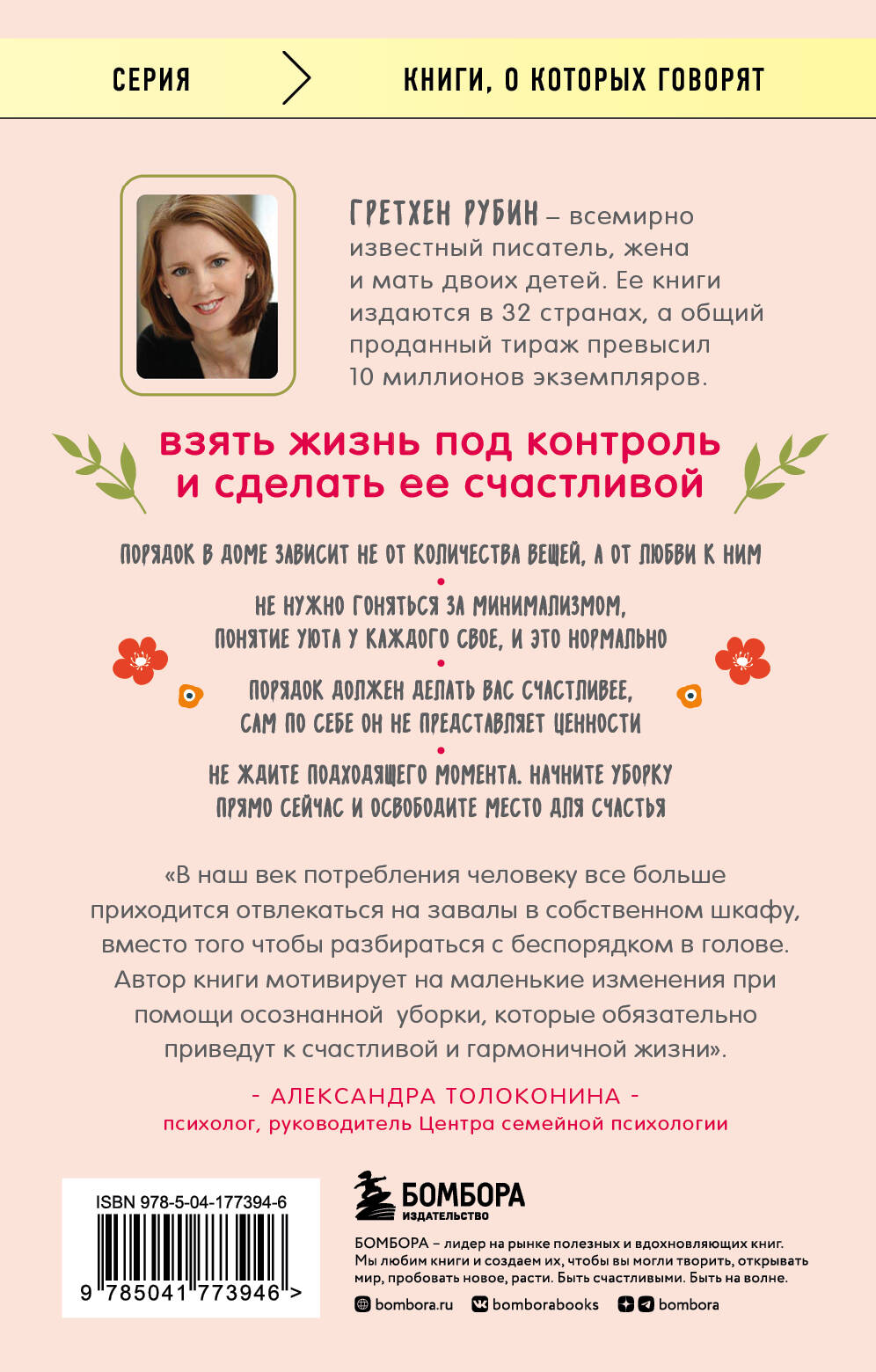 ОБ АВТОРЕ Гретхен Рубин - всемирно известный писатель, жена и мать двоих детей. Ее книги издаются в 32 странах, а общий проданный тираж превысил 10 миллионов экземпляров. ВЗЯТЬ ЖИЗНЬ ПОД КОНТРОЛЬ И СДЕЛАТЬ ЕЕ СЧАСТЛИВОЙ. • Порядок в доме зависит не от количества вещей, а от любви к ним. • Не нужно гоняться за минимализмом, понятие уюта у каждого свое, и это нормально. • Порядок должен делать вас счастливее, сам по себе он не представляет ценности. • Не ждите подходящего момента. Начните уборку прямо сейчас и освободите место для счастья. «В наш век потребления человеку все больше приходится отвлекаться на завалы в собственном шкафу, вместо того чтобы разбираться с беспорядком в голове. Автор книги мотивирует на маленькие изменения при помощи осознанной уборки, которые обязательно приведут к счастливой и гармоничной жизни». - Александра Толоконина, психолог, руководитель Центра Семейной Психологии| Издательство | ООО "Издательство "Эксмо" |