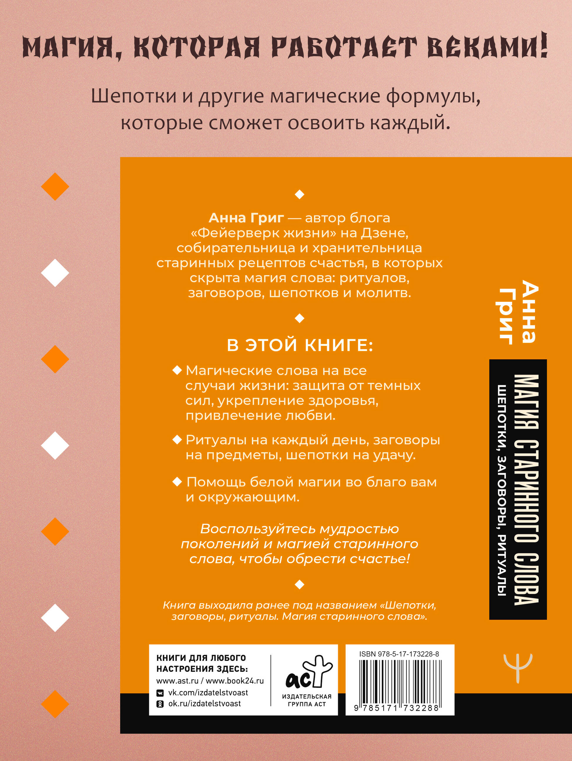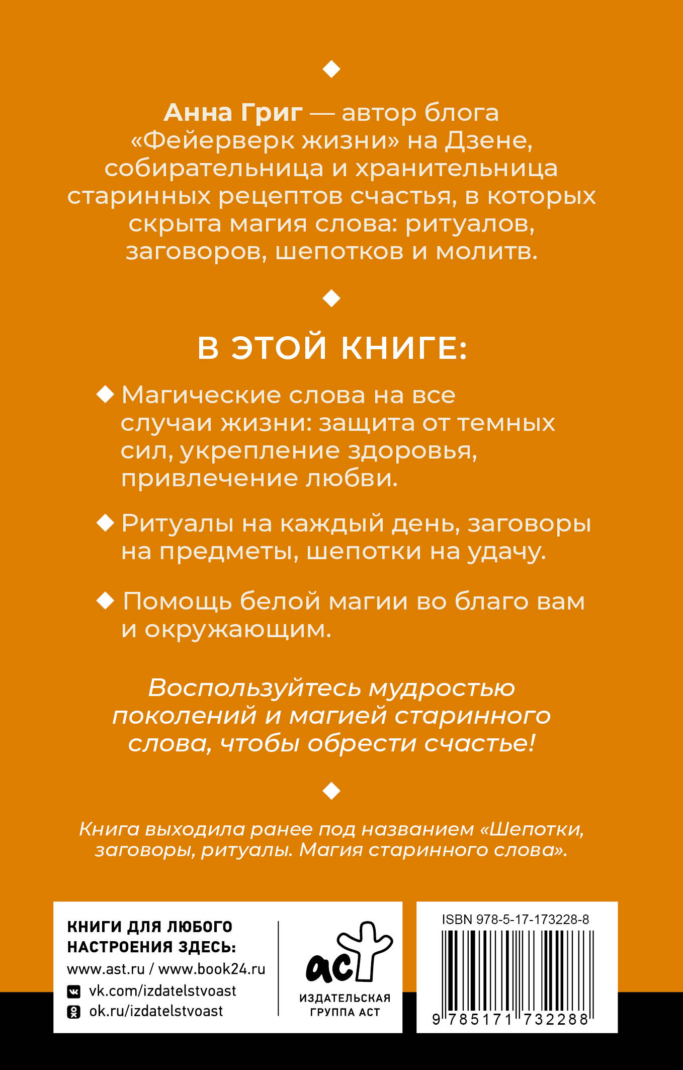Анна Григ - автор блога "Фейерверк жизни" на Дзене, собиратель старинных рецептов счастья, основанных на магии слова: ритуалов, заговоров, шепотков и молитв. Слово обладает великой силой, и пользоваться ею нужно с умом. Наши предки знали магические шепотки и заговоры, которые помогали избежать бед и несчастий, привлечь удачу и успех. Потомственная ведунья Анна Григ много лет собирает народные магические обряды и ритуалы, которые позволяют справляться с трудностями повседневной жизни. Магия старинного слова поправит любые дела: укрепит защиту и здоровье, привлечет деньги и любовь, наладит отношения с близкими и приведет счастье в дом. С помощью проверенных временем магических формул вы улучшите жизнь, не причиняя вреда себе и другим. Исключительно белая магия подарит долгожданную гармонию и благополучие. Книга выходила ранее под названием "Шепотки, заговоры, ритуалы. Магия старинного слова".| Издательство | Издательство "АСТ" |