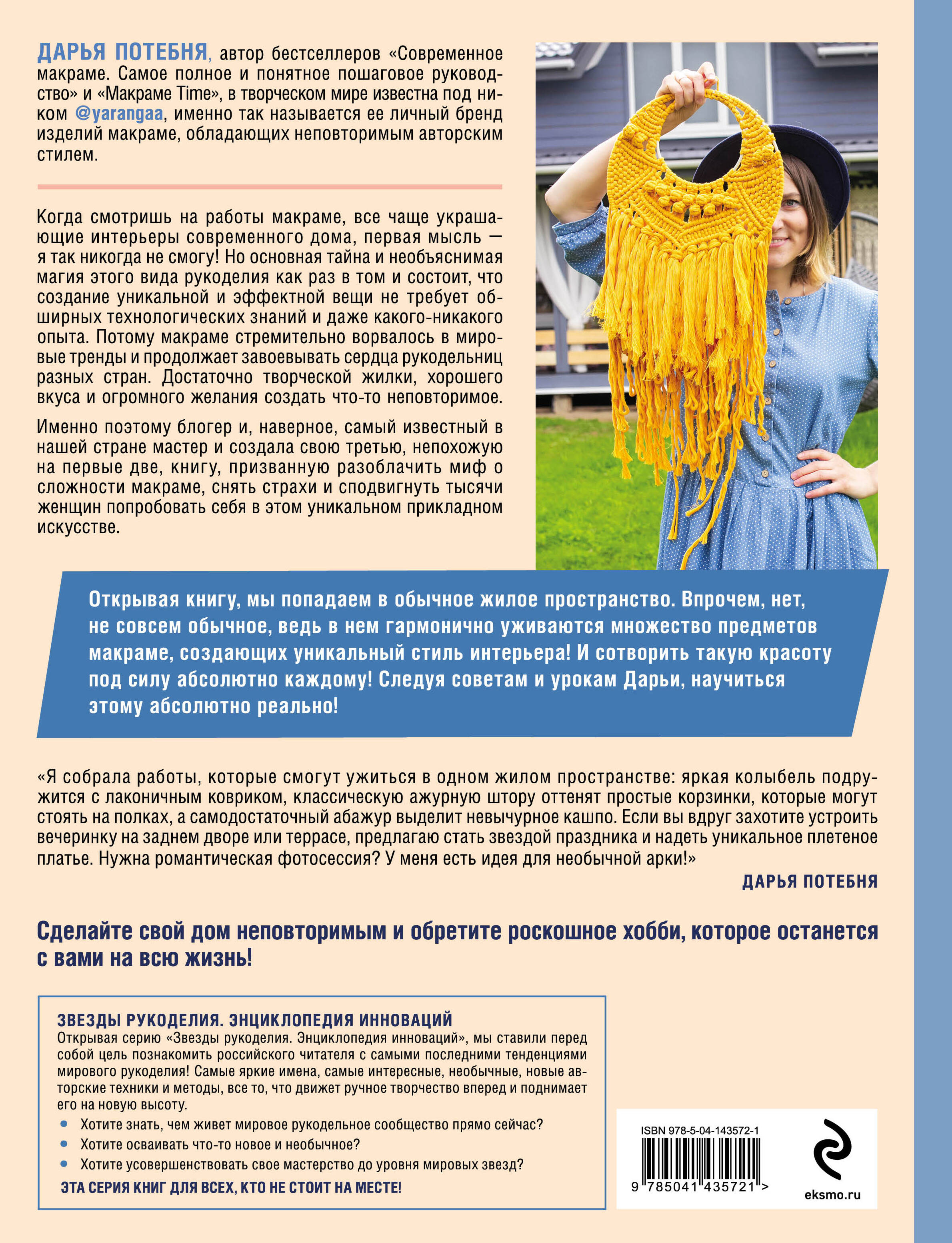 Новый подарок всем любителям рукоделия от самого узнаваемого мастера, блогера и автора бестселлеров «Современное макраме» и «Макраме Time» Дарьи Потебня @yarangaa! Третья книга была задумана в ответ всем, кто, глядя на изысканные и филигранные изделия в технике макраме, говорит про себя - я так никогда не смогу! Каждый сможет убедиться, что, используя всего три узла и несколько вариантов их комбинаций, можно творить настоящие чудеса! Например, декорировать интерьер в стиле макраме. От коврика до колыбели, от панно до арки для фотосессии. Проявив определенную смелость, можно сплести даже вечернее платье! И, как всегда у Дарьи, обучающий материал дается подробно, понятно, четко, каждый шаг проиллюстрирован. А авторские проекты заставляют просто замирать в восхищении фантазией мастера. Теперь вы сможете не только повторить ее произведения, но и придумать, и воплотить собственные, и даже найти свой собственный стиль!| Издательство | ООО "Издательство "Эксмо" |
