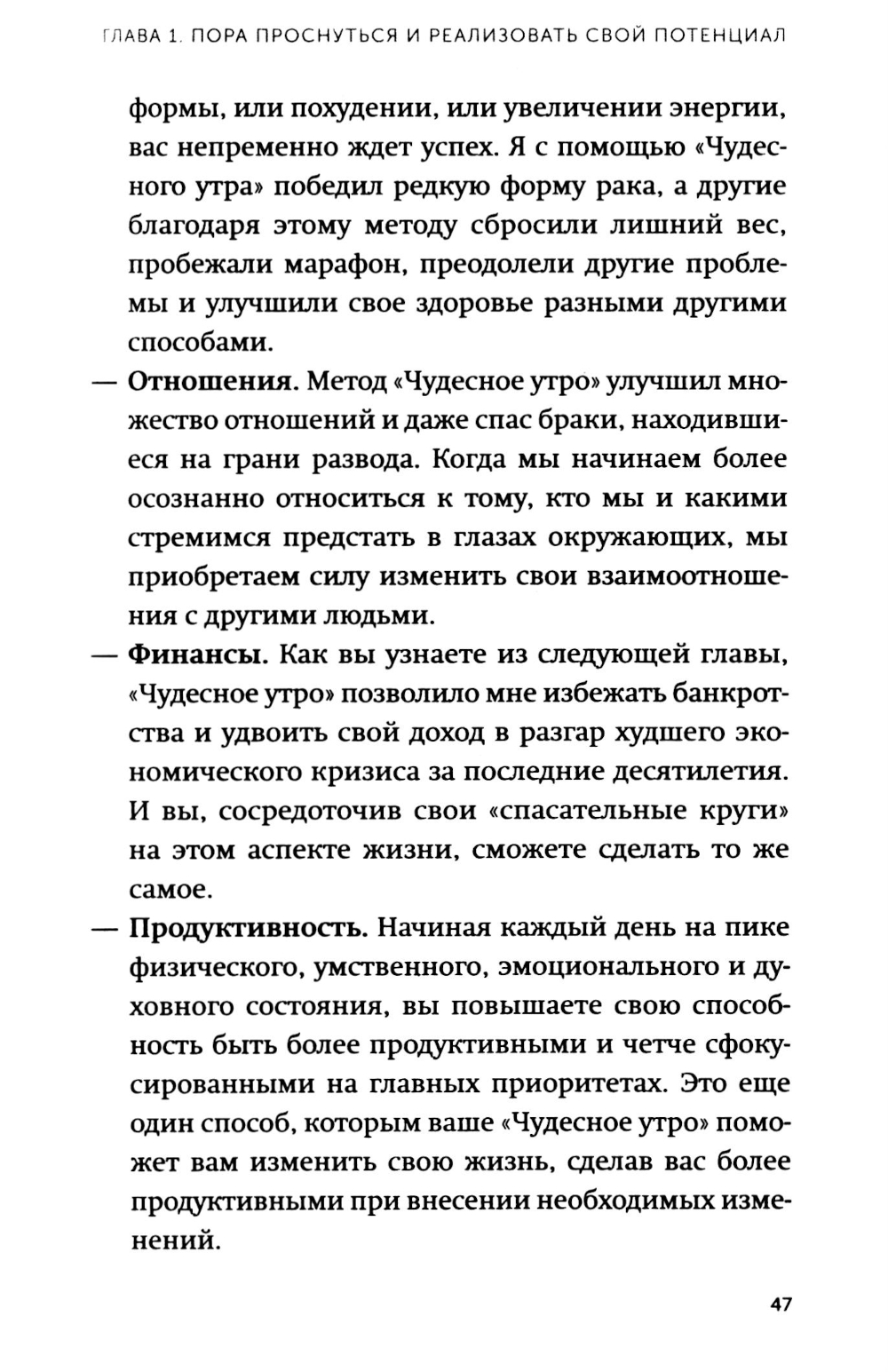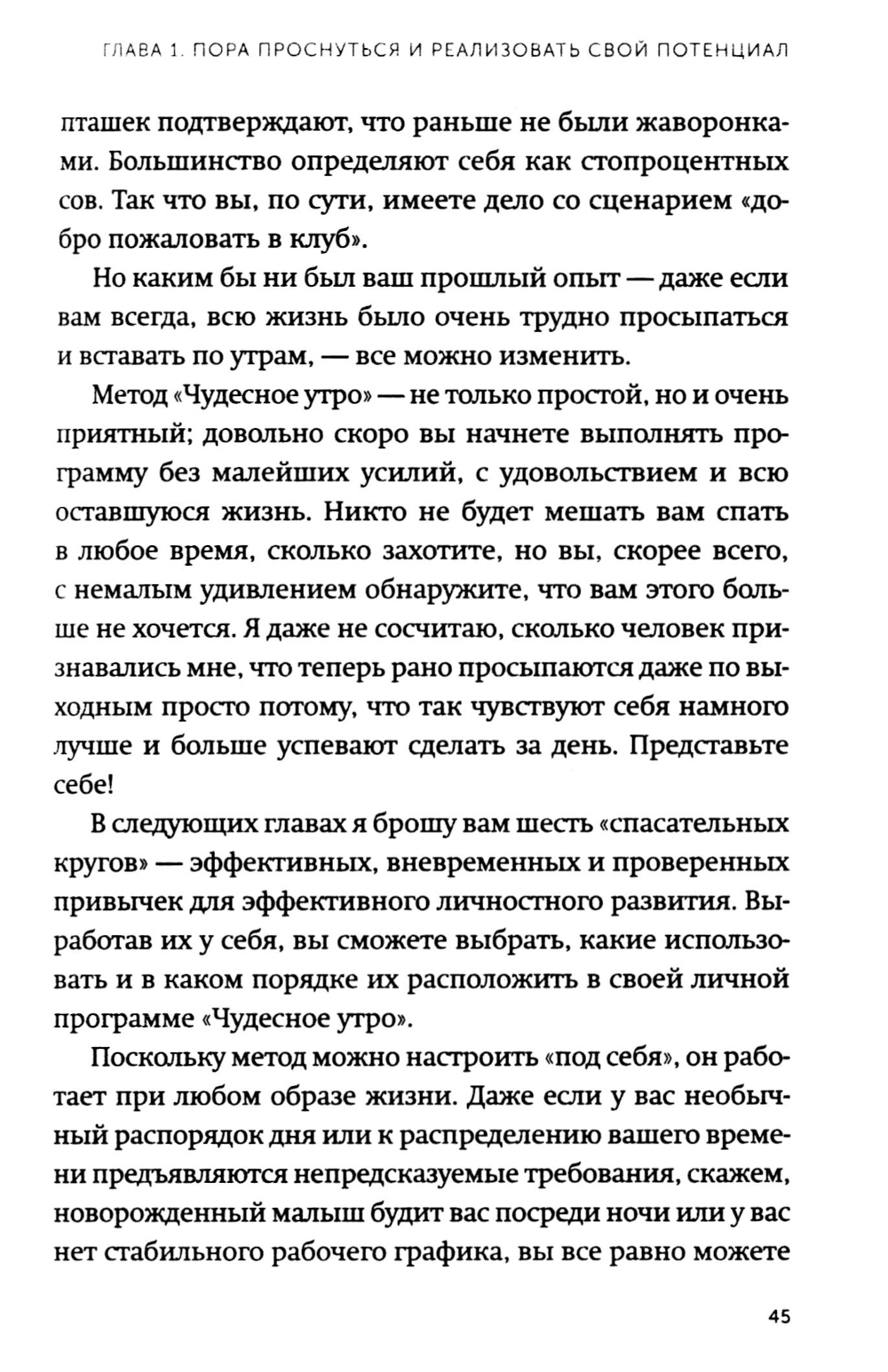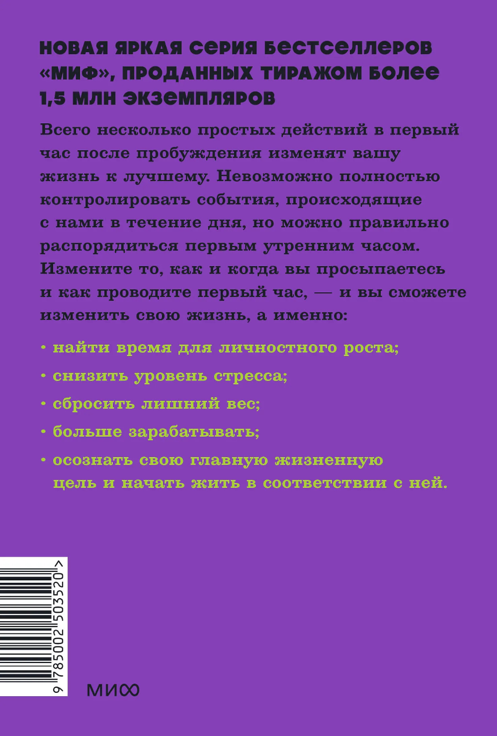 Книга, которая помогла тысячам людей изменить жизнь за счет правильного начала дня и утренних ритуалов - теперь в формате покетбука. Что, если завтра любая (или даже каждая) сфера вашей жизни могла бы чудесным образом измениться? Что было бы иначе? Вы стали бы счастливее? Здоровее? Успешнее? Вы были бы в лучшей физической форме? Стали бы богаче? Энергичнее? Что, если существует простой, но не очевидный секрет, который гарантированно поможет вам изменить любую сторону вашей жизни - и сделать это быстрее, чем вы можете себе представить? Утренние ритуалы, которые предлагает осуществлять автор этой книги, помогли десяткам тысяч людей изменить свою жизнь, почувствовать себя лучше и успевать больше. Из книги вы узнаете, как первый час дня определяет ваш успех и позволяет вам раскрыть свой потенциал полностью. Измените то, как и когда вы просыпаетесь и как проводите первый час - и вы сможете изменить свою жизнь, а именно: - Снизить уровень стресса; - Улучшить общее здоровье, сбросить лишний вес (если необходимо); - Просыпаться каждое утро с зарядом энергии; - Больше зарабатывать; - Найти свое призвание и следовать ему; - Повысить продуктивность и научиться фокусироваться на ключевых задачах.