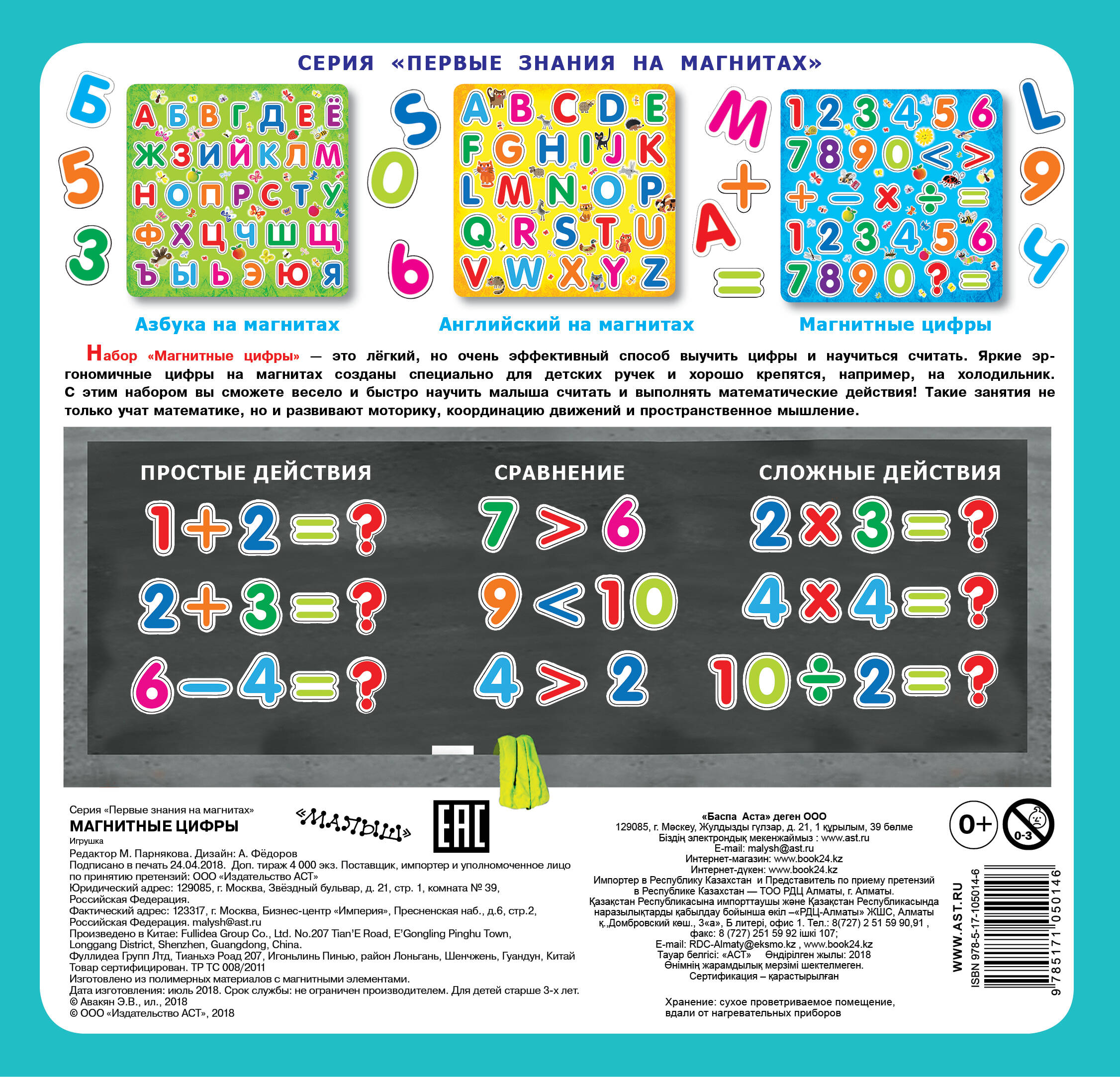 «Магнитные цифры» - отличный подарок будущему первокласснику, который поможет: - выучить первый счёт, - познакомиться с понятиями «больше», «меньше» или «равно», - научиться складывать, вычитать, делить и умножать, - развить моторику и координацию движений, - развить пространственное мышление, - в игровой форме дать малышу необходимые первые знания.| Издательство | АСТ |