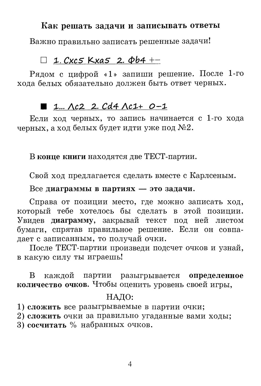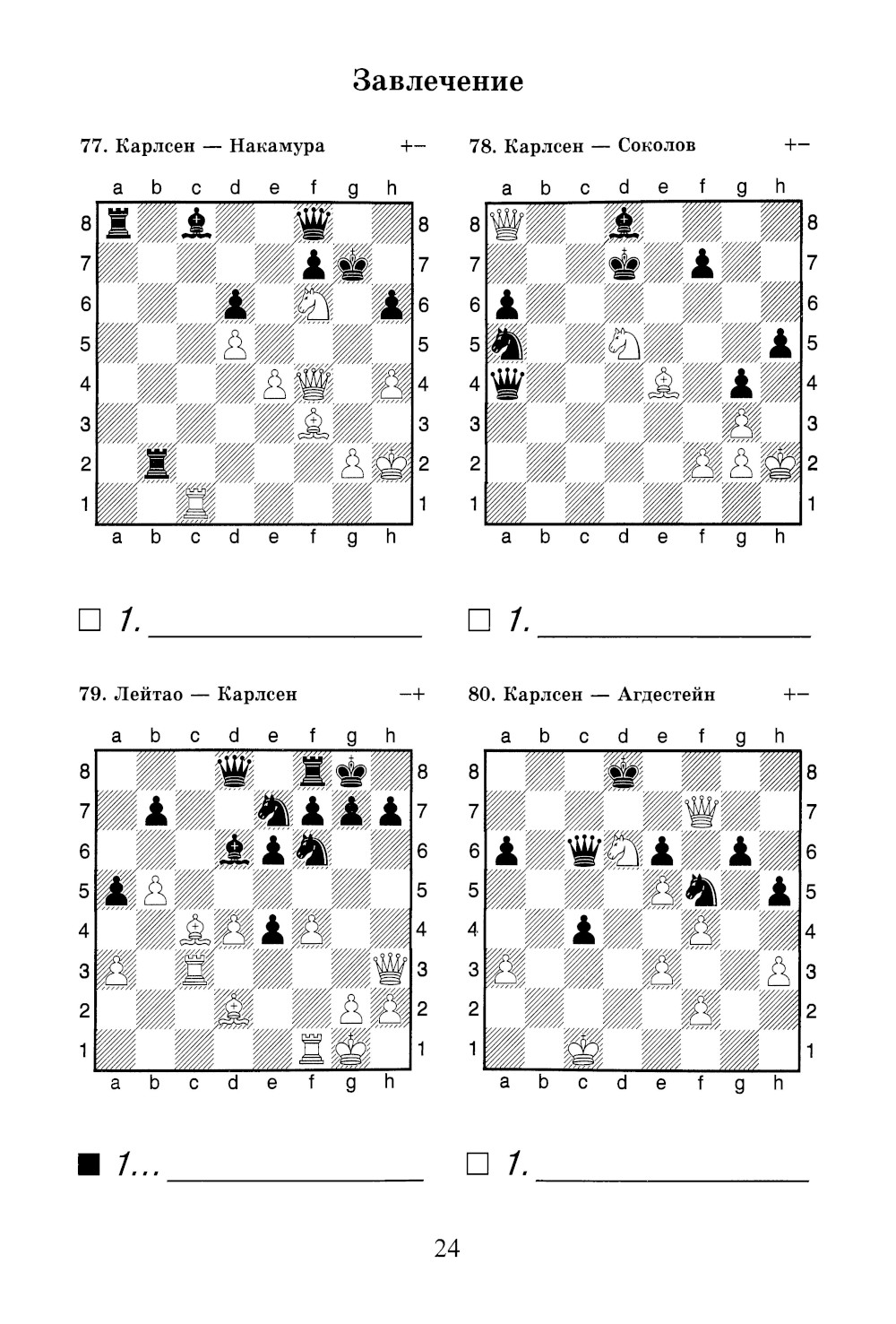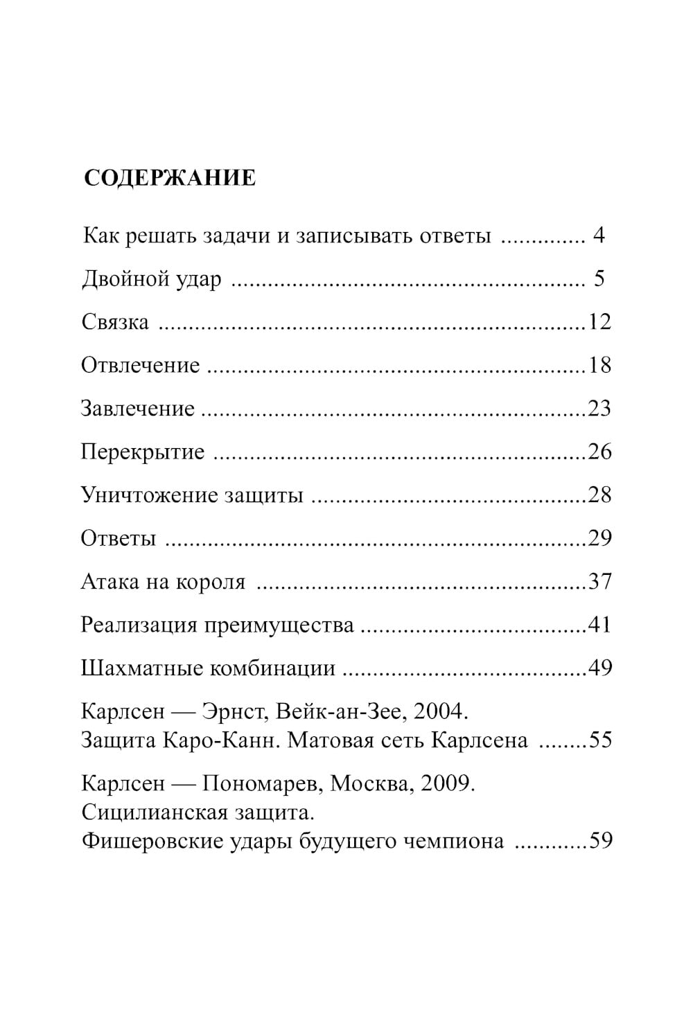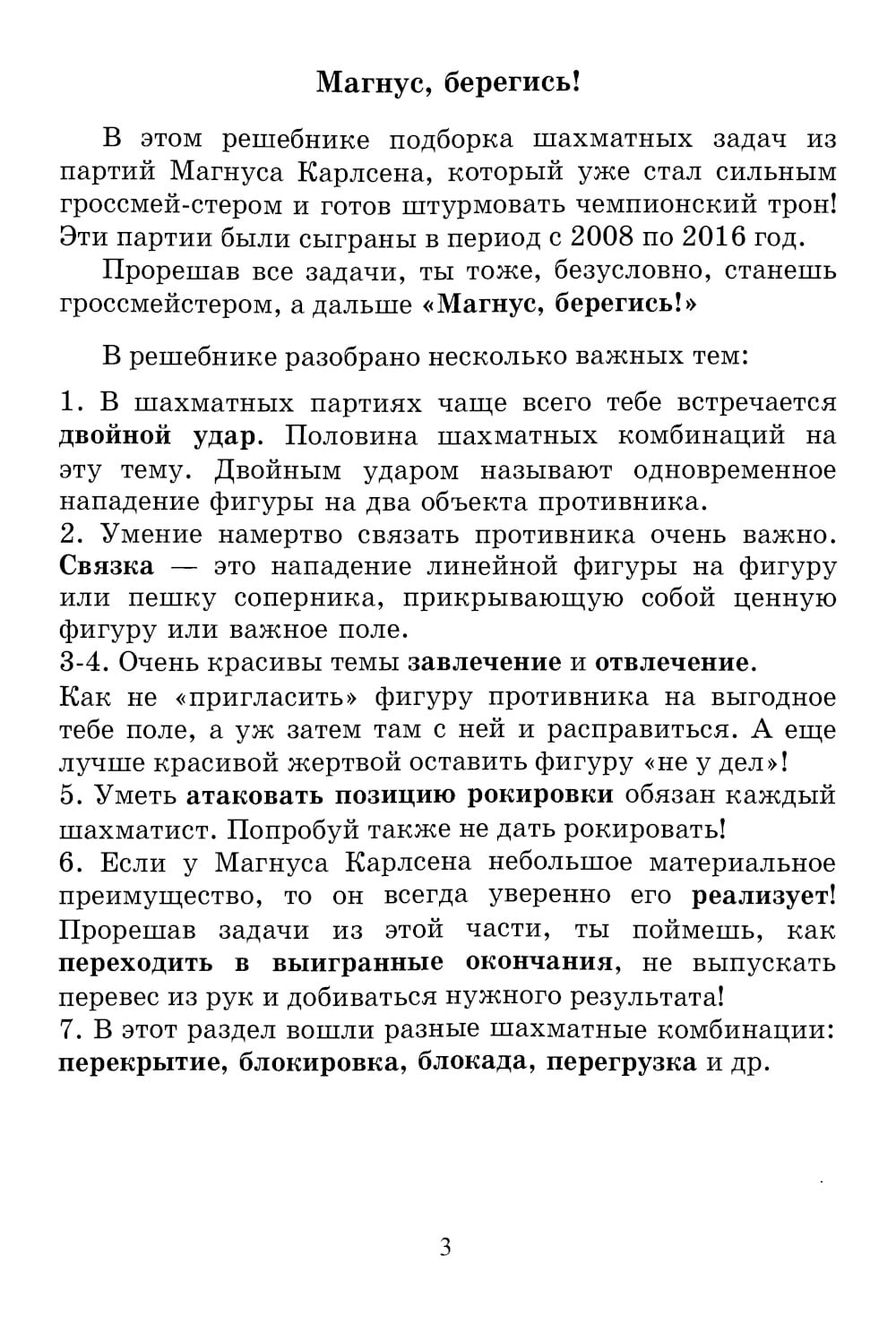 В этом решебнике собраны комбинации из партий Магнуса Карлсена, который уже стал сильным гроссмейстером и готов штурмовать чемпионский трон! В книге ты найдешь задачи на разные темы: двойной удар, связка, завлечение и отвлечение, перекрытие, блокировка, блокада, перегрузка. Но самое главное Карлсен научит тебя реализовывать материальное преимущество и переходить в выигранные окончания. Прорешав все задачи, ты безусловно, значительно повысишь уровень своей игры, а дальше «Магнус, берегись!»